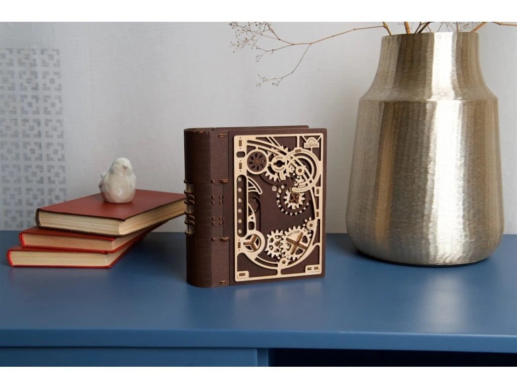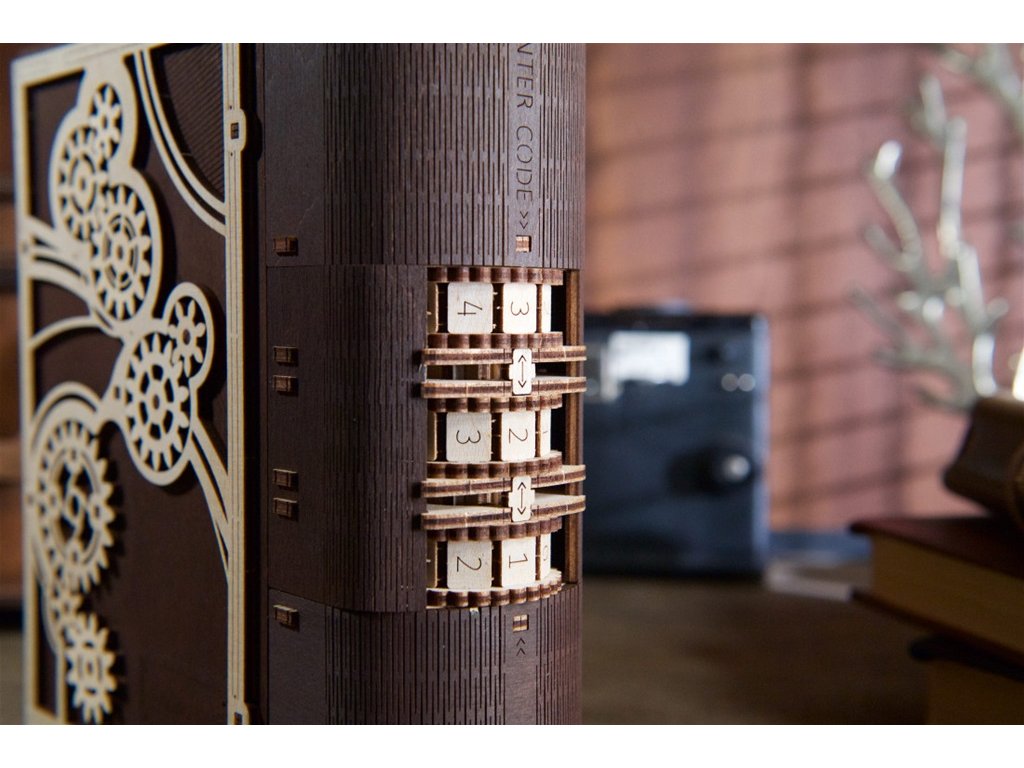 Knihy byly používány k ukrývání předmětů téměř tak dlouho, co existují. Do knihy vyhloubíte otvor, schováte svou cennost a knihu uložíte na polici mezi další svazky a nikdo kromě Vás nepozná, že je něčím vyjímečná. Stavebnice knihy, která je zároveň skrýší na tajnosti, je vyrobena z překližky. Po sestavení se kniha promění ve funkční schránku, do které můžete vložit své poklady nebo vzkaz pro někoho blízkého, protože tato zdobená kniha může být i netradičním a zábavným dárkem a bude se báječně vyjímat na polici. Kombinace přírodního a tmavého dřeva spolu s originálními a funkčními pohyblivými detaily jako jsou ozubená kola na přední straně nebo číselník na hřbetu knihy přispěje k nezapomenutelnému zážitku při sestavování. Knihu otevřete pomocí třímístného kódu na hřbetu knihy a otočením klíče a ozubených koleček anebo i bez toho, že byste věděli číselnou kombinaci. Puzzle je vybaveno detailním návodem k sestavení, a to bez použití lepidla. Hlavní vlastnosti: 263 precizně vyřezaných dílkůvyrobeno ze dřeva z udržitelných zdrojůstřední obtížnost sestavenívhodné jako dárek nebo interiérový doplněks tajným prostorem uvnitřpodporuje kreativní myšlení rozvíjí schopnost řešit problémy navrženo a vyrobeno na Ukrajině Dokumentace: obrázkový návod ke stažení zde