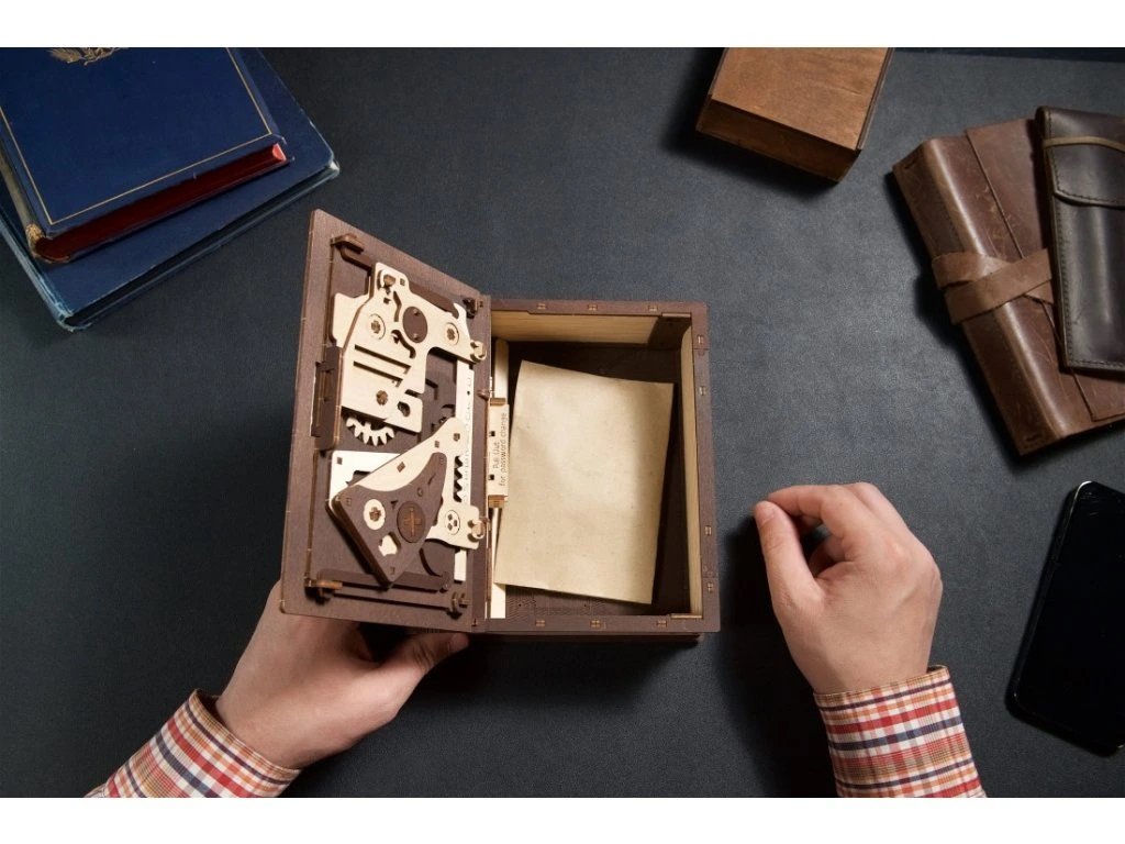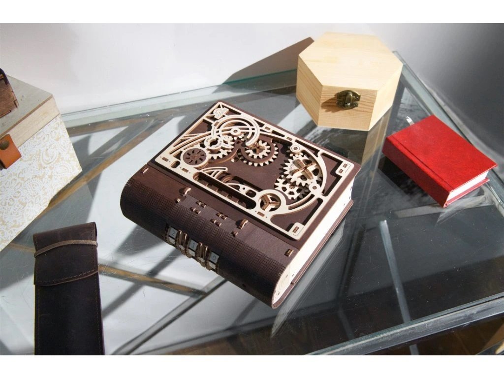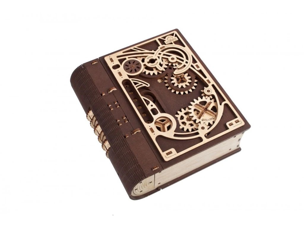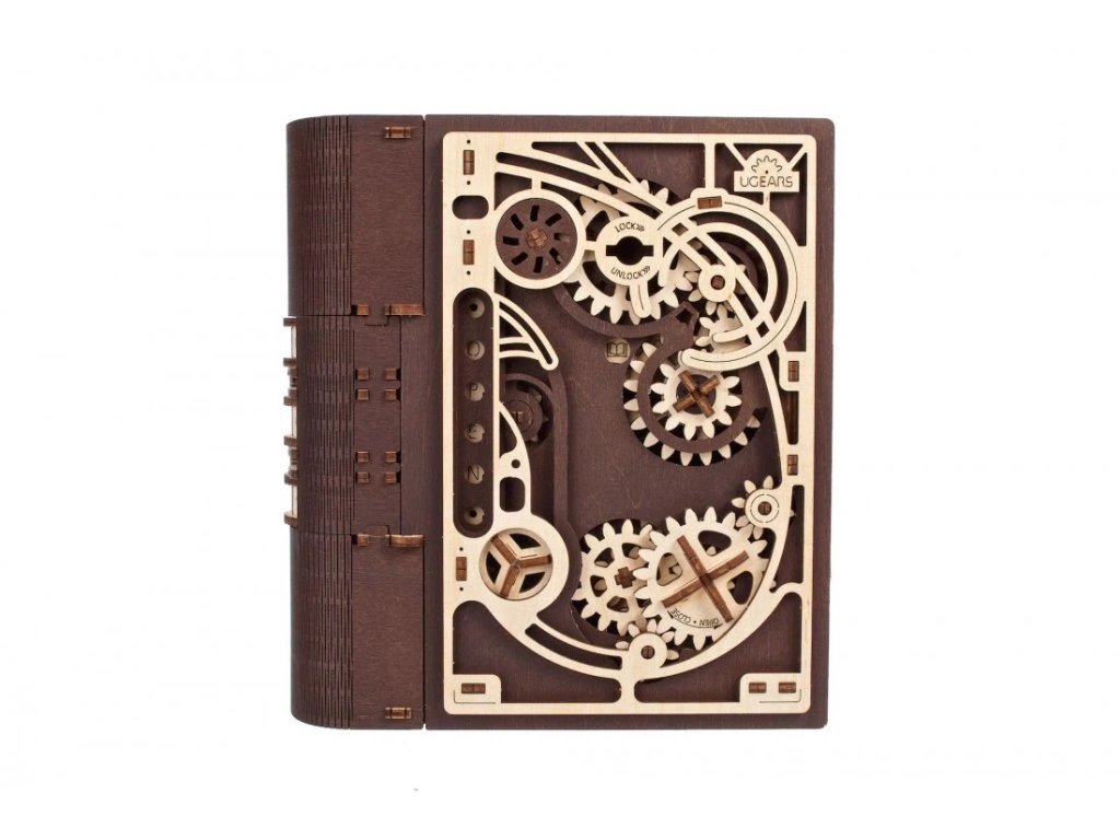 Knihy byly používány k ukrývání předmětů téměř tak dlouho, co existují. Do knihy vyhloubíte otvor, schováte svou cennost a knihu uložíte na polici mezi další svazky a nikdo kromě Vás nepozná, že je něčím vyjímečná. Stavebnice knihy, která je zároveň skrýší na tajnosti, je vyrobena z překližky. Po sestavení se kniha promění ve funkční schránku, do které můžete vložit své poklady nebo vzkaz pro někoho blízkého, protože tato zdobená kniha může být i netradičním a zábavným dárkem a bude se báječně vyjímat na polici. Kombinace přírodního a tmavého dřeva spolu s originálními a funkčními pohyblivými detaily jako jsou ozubená kola na přední straně nebo číselník na hřbetu knihy přispěje k nezapomenutelnému zážitku při sestavování. Knihu otevřete pomocí třímístného kódu na hřbetu knihy a otočením klíče a ozubených koleček anebo i bez toho, že byste věděli číselnou kombinaci. Puzzle je vybaveno detailním návodem k sestavení, a to bez použití lepidla. Hlavní vlastnosti: 263 precizně vyřezaných dílkůvyrobeno ze dřeva z udržitelných zdrojůstřední obtížnost sestavenívhodné jako dárek nebo interiérový doplněks tajným prostorem uvnitřpodporuje kreativní myšlení rozvíjí schopnost řešit problémy navrženo a vyrobeno na Ukrajině Dokumentace: obrázkový návod ke stažení zde
