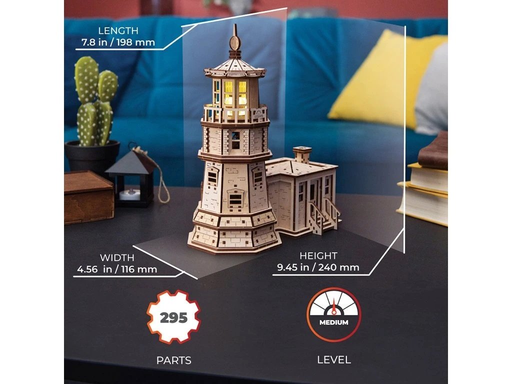 Stavebnice majáku Split Rock je dřevěná reprodukce ikonického minnesotského majáku s osmihrannou věží a připojeným domem strážce. Tento maják byl postaven na skalním útesu tyčícím se do výšky 133 m poblíž města Minnesota, aby zabránil lodím ve ztroskotání, a poprvé byl zapálen 31. července 1910. V krátké době se stal turistickou atrakcí a dodnes zůstává jedním z nejmalebnějších a nejnavštěvovanějších majáků ve Spojených státech. Model je vyroben z uměleckého dřeva, laserové gravírování na vnějších plochách vytváří vzhled kamene a cihel. Díky příjemnému LED osvětlení v teplém tónu vnese model útulnou atmosféru do Vašeho domova a může se stát funkčním nočním osvětlením Vaší ložnice, dětského pokoje nebo kanceláře. Kopule modelu je otočná, dveře strážcova domu se otevírají a zavírají pomocí gumového mechanismu a okna jsou opatřena závěsy, které se při pohybu houpou.K sestavení modelu není zapotřebí žádné nářadí ani lepidlo. Stačí vytlačit přesné, laserem vyřezané dílky z dřevěných desek, zacvaknout je k sobě a model je hotov. Tato stavebnice je vhodná pro středně pokročilé stavitele, sestavení trvá cca 6 hodin a součástí balení je vše, co potřebujete k montáži včetně vosku, brusného papíru a podrobného obrázkového návodu v 11 jazycích. Model je napájen pomocí USB-C kabelu nebo 3 AA baterií. Ani kabel ani baterie nejsou součástí balení. LED světlo je možné jednoduše vyměnit otočením a vyjmutím z kopule věže majáku. Pokud se Vám tento model líbí, rozšiřte svou sbírku majáků pomocí 3D dřevěného mechanického puzzle Alexandrijský maják (UG70154). Hlavní vlastnosti: LED osvětlení v teplém tónupohyblivé součástinapájení pomocí USB-C kabelu a 3 AA baterií (ani kabel ani baterie nejsou součástí balení)kvalitní materiál a zpracování295 laserem vyřezaných dílků střední obtížnost sestavenídoba sestavení 6 hodinobrázkový návod v 11 jazycích je součástí balenírozvíjí kreativitu, trpělivost a technické myšlenívhodné jako dárek