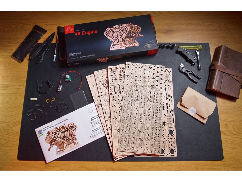 Motory V8 se svým typickým zvukem jsou synonymem síly. Díky vyváženému uspořádání dvou řad čtyř válců do V vytvářejí méně vibrací než šestiválcové motory, což umožňuje vyšší výkon. Motor V8 byl patentován v roce 1902 francouzským inženýrem Léonem Levavasseurem a jeho typické využití je ve výkonných automobilech. Málo se ví, že motory V8 byly používány v motorových člunech a dokonce v letadlech a motorkách. V8 Engine je model v měřítku 1:6, který funguje buď pomocí elektromotoru, nebo otáčením knoflíku, což vám umožní sledovat fascinující fungování tohoto ikonického spalovacího motoru. Model přesně zobrazuje všechny hlavní mechanismy skutečného osmiválce, včetně osmi válců s rytmicky se pohybujícími písty, přičemž dva válce „vystřelí“ na každých 90 stupňů otočení klikové hřídele, 16 ventilů s pružinami, které se otevírají a zavírají, jak je tlačí hlavy na rotujících vačkových hřídelích, komponenty klikové skříně a ventilového rozvodu spojené s rozvodovým řetězem a škrticí klapkou na sacím potrubí. Model je poháněn elektromotorem stylizovaným jako generátor. Hadovitý řemen spojuje řemenici klikové hřídele s ostatními řemenicemi spojující příslušenství motoru, jako je kompresor klimatizace, alternátor, čerpadlo posilovače řízení a vodní pumpa. Připojte model ke zdroji napájení pomocí kabelu USB-C, poté zapněte vypínač a sledujte, jak motor ožívá, nebo ručně uveďte motor V-8 do pohybu otočným knoflíkem umístěným pod vypínačem.Model je realisticky zpracován do nejmenších detailů, jako je stylizované výfukové potrubí, zapalovací svíčky, olejová vana, měrka oleje a víčka na olej a brzdovou kapalinu. Model se sestavuje postupně – nejprve blok válců, poté bloky ventilů, což vám umožní lépe porozumět fungování motoru. Rozvodový řetěz má 32 článků a jeho napnutí lze nastavit pomocí dvou napínačů, které zajišťují, že řetěz není příliš volný nebo příliš napnutý.Model můžete ponechat v atraktivním vzhledu přírodního dřeva nebo jej nabarvit či namořit (barvy nejsou součástí dodávky). Je určen pro zkušenější modeláře a k jejímu sestavení není potřeba lepidlo ani speciální nástroje. Všechny pohyblivé části je potřeba obrousit přiloženým brusným papírem a namazat voskem (či jiným vhodným mazivem). Součástí balení je podrobný obrázkový návod v 11 jazycích. Hlavní vlastnosti: rozvíjí kreativitu, trpělivost a technické myšleníkvalitní materiál a zpracování776 laserem vyřezaných dílků včetně 25 náhradních dílůvysoká obtížnost sestaveníobrázkový návod v 11 jazycích je součástí balenínapájení pomocí USB-C kabelu (je součástí balení)vhodné jako dárekvyrobeno na Ukrajině