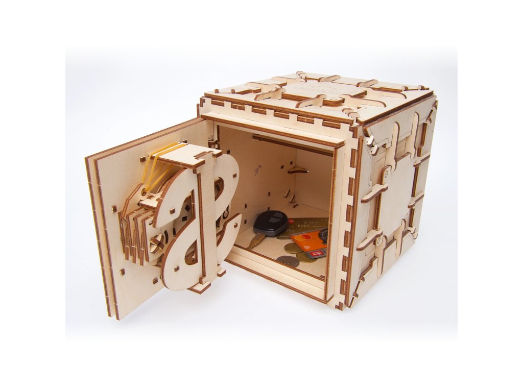 Zkouška Vašeho důmyslu. Stavebnice trezoru vyrobená z překližky. Do úložného prostoru o rozměrech 15x14x10 cm lze uschovat cennosti i drobné listiny, k zabezpečení slouží trojmístný číselný kód uživatelsky zadaný při sestavení. Pohyb propracovaného mechanismu můžete pozorovat několika okýnky. K otevření zadejte první číslici otáčením proti směru hodinových ručiček, druhou ve směru opačném, vpravo, a nakonec třetí opět otáčením doleva. Trezor zamknete prostým otočením číselníku doleva. Pokuste se prolomit kombinaci pomalým otáčením číselníku a pečlivým poslechem pohybů stavítka! Vybaveno detailním návodem k sestavení. Hlavní vlastnosti: 179 precizně vyřezaných dílkůvysoká obtížnost sestavenítrojmístný, uživatelsky volený kódrozměrný úložný prostornavrženo a vyrobeno na Ukrajině