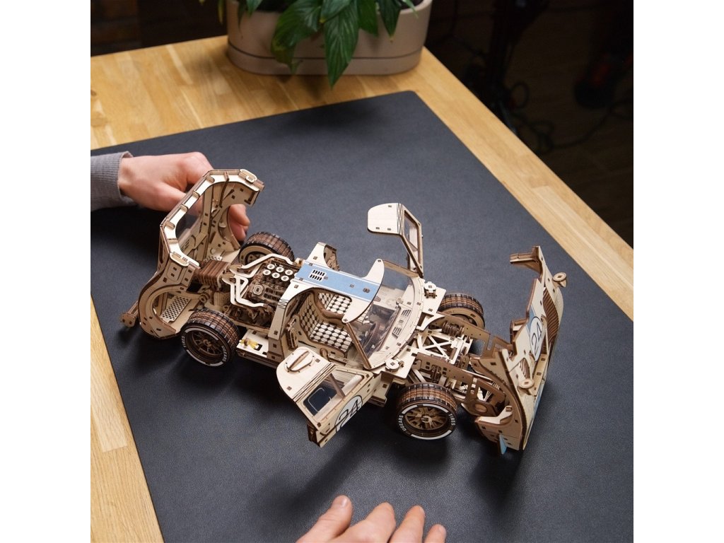 GT-24 Endurance Racer je dřevěný model v měřítku 1 : 12 inspirovaný ikonickými závodními vozy z 60. let minulého století. Toto dvoudveřové sportovní kupé potěší každého motoristického nadšence detailním zpracováním a mnoha funkčními prvky, jako jsou plné odpružení, otevírací kapota a kufr, zamykací dveře, silikonové pneumatiky pro extra přilnavost, barevné závodní pruhy a okna, motor V8 s pohyblivými písty a řadicí páka s režimy vpřed, vzad a sport pro extra zrychlení. Mezi pohyblivé části tohoto modelu patří ventilátor chladiče, ruční brzda, víčko palivové nádrže a zamykatelné dveře. Vyjměte z kufru klíč, zasuňte jej do mechanismu pod podvozkem, přepněte spínač stop/start nebo zařaďte neutrál, abyste mohli pozorovat pohybující se písty. Závodní vůz je schopen ujet 5 až 6 metrů. Skládačka je dodávána v nesloženém stavu, zabalená v krabici s podrobným návodem k sestavení v 11 jazycích. Všechny dílky jsou přesně vyřezané a lehce do sebe zapadnou bez použití lepidla či nástrojů, aby výsledek byl stabilní a odolný. Hlavní vlastnosti: 970 dílkůvysoká obtížnost sestavenífunkční řadicí páka s převody vpřed, sportovní, neutrál a zpátečkavíceprvkové pružinové zavěšení na všech čtyřech kolechpružinový motor s natahovacím klíčemotevírání kapoty a zavazadlového prostoru, pohyblivá ruční brzda a stěrače čelního sklapohyblivé písty motoru V-8 a ventilátor chladičefunkční volantaerodynamický design s realistickými detailymodrý závodní pruh a plastová oknasestavení bez lepidla a nářadípodrobný návod k sestavení v 11 jazycíchnavrženo a vyrobeno na Ukrajině