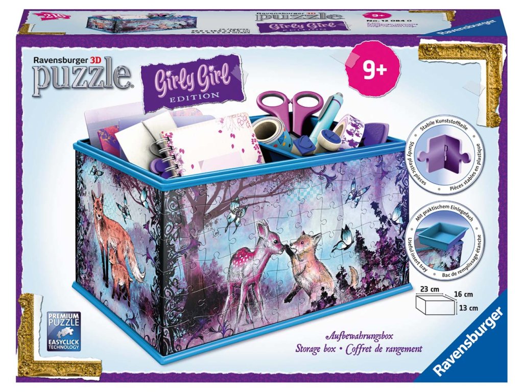 216 pevných plastových dílků puzzle sloužících k vytvoření pevné úložné krabice, která je kouzelným doplňkem pokoje každé dívky. Stačí postavit puzzle, přidat příslušenství a máš úložnou krabici, která je velmi praktická a s volně nastavitelnou přihrádkou. Je použitelná např. pro dívčí poklady, dopisy a jiné drobnosti.... Obsah: 216 číselně označených dílků puzzle + přihrádka + 3 doplňky (příslušenství) + návod. Doporučený věk 9+