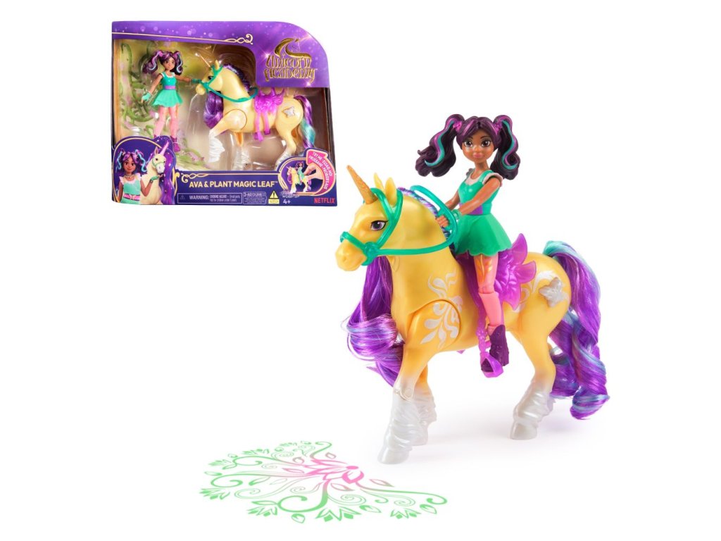 Jednorožec Leaf 13 cm a panenka Ava 11 cm. Jednorožec umí zvednout nohu a pak před sebou rozsvítí na zem duhové hvězdy stejně jako v seriálu.