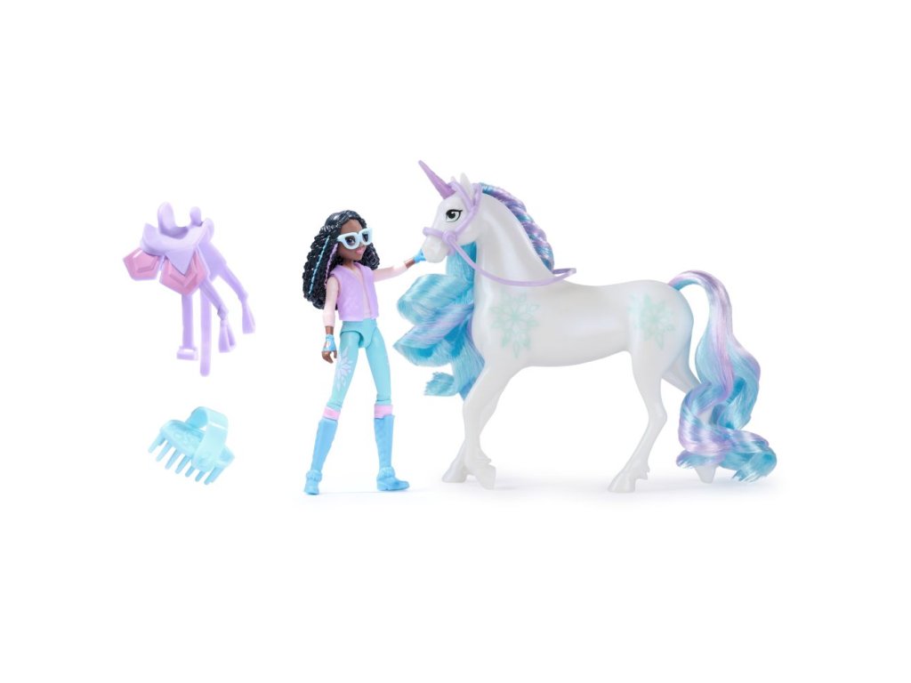 Oslavte pouto mezi jezdcem a jednorožcem se sadou figurek Layly a Vločky! Tato sada inspirovaná animovaným seriálem od NETFLIXu a bestsellerovou knižní sérií, kde přátelství drží otěže osudu, podnítí nekončící nápaditá vyprávění. 11,5cm figurka Layly se pyšní realisticky věrnými detaily a 7 klouby pro dynamické pózy. Vločka měří bezmála 13 cm a doplňuje vzhled Layly svými znaky ledové magie a modro-bílo-růžovou hřívou a ocasem, které lze kartáčovat (kartáč je součástí balení). Při hraní posaďte Laylu na Vločku a jeďte za dobrodružstvím! Díky odnímatelné uzdě a sedlu zůstane Layla bezpečně na svém místě a z Vločky nespadne. Chcete-li objevit všechny způsoby, jak si užít svět Jednorožčí akademie se svými oblíbenými postavami, prohlédněte si další malé panenky, jako jsou Sofie, Ava, Isabel a Valentina spolu s jejich jednorožci (sady se prodávají samostatně) a rozšiřte svůj kouzelný svět! Určeno pro děti, které mají rády jednorožce a koně, panenky a doplňky, hračky pro panenky, sběratelské předměty, plyšové hračky a další. Hračky s tematikou Jednorožčí akademie jsou perfektním dárkem pro dívky k narozeninám nebo jakékoli jiné příležitosti. Zažijte okouzlující dobrodružství v Jednorožčí akademii se sadou figurek Layly a Vločky!