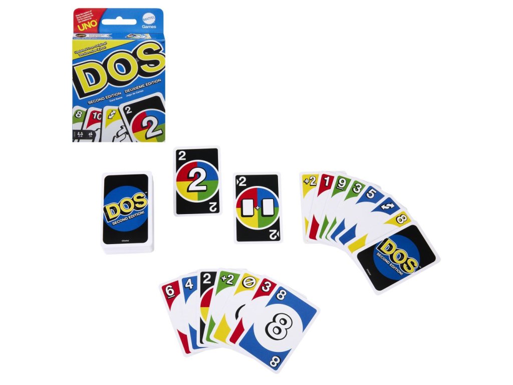 Stejně jako u karetních her UNO®, i ve hře DOS hráči závodí, kdo se jako první zbaví všech karet – tentokrát ale s novými kartami a pravidly, která dělají hru ještě zábavnější pro společné herní večery. Ve hře jsou dvě odkládací hromádky a každá karta s číslem 2 je „divokou kartou DOS“, což znamená, že může představovat libovolnou barvu dvojky, jakou si hráč zvolí. Akční karty zahrnují klasiku, ale také novinku – kartu „Divoká karta: zahraj dvě“, která přinutí dalšího hráče zahrát minimálně dvě karty během svého tahu, a pokud to nedokáže, musí si líznout dvě karty. Přátelé a rodina zažijí při hře dvojnásobnou akci a spoustu zábavy. Barvy a vzhled karet se mohou lišit.