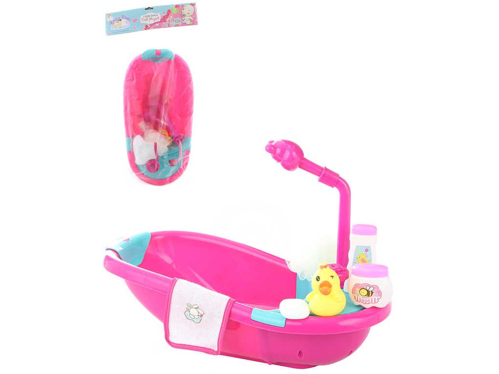 Toaletní plastový set jako doplněk ke hrám s panenkou - miminkem, pro všechny malé maminky. Sada obsahuje vaničku se sprchou, hračku do vody, ručník, mýdlo a další. Baleno v sáčku.