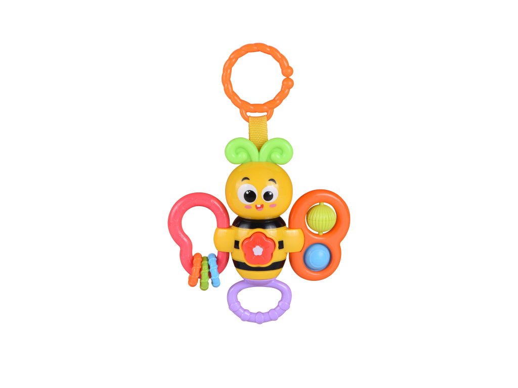 Včelka hrající s klipem. Velikost 14 cm. Tlačítko spouští a přepíná melodie. Chrastí, lze zavěsit. 2x AAA baterie součástí.