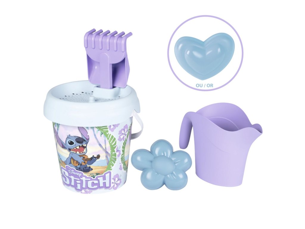 Set na písek s motivem Stitch. Součástí je sítko, hrabičky, lopatka, formička na písek ve tvaru srdíčka nebo kytičky a konvička. Průměr kyblíčku 18 cm. Výška kyblíčku s příslušenstvím 29 cm.