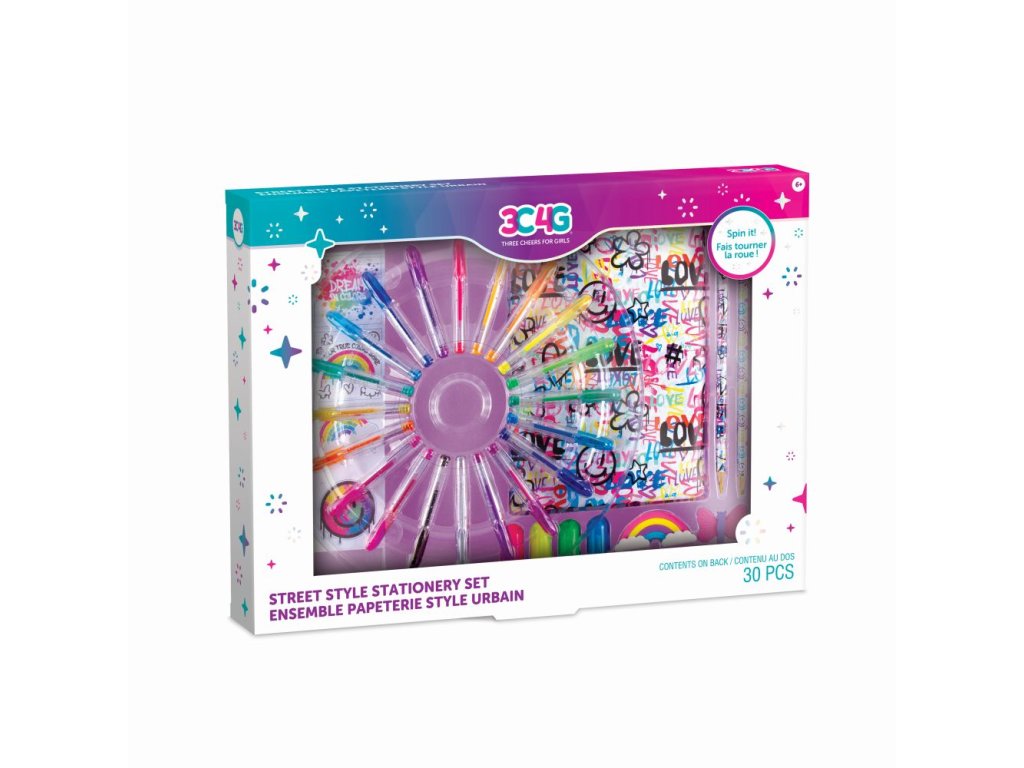 Velká otočná sada kancelářských potřeb obsahuje blok, 20 mini gelových per, 2 gumy, 2 barevné tužky, 4 zvýrazňovače, 4 vinylové