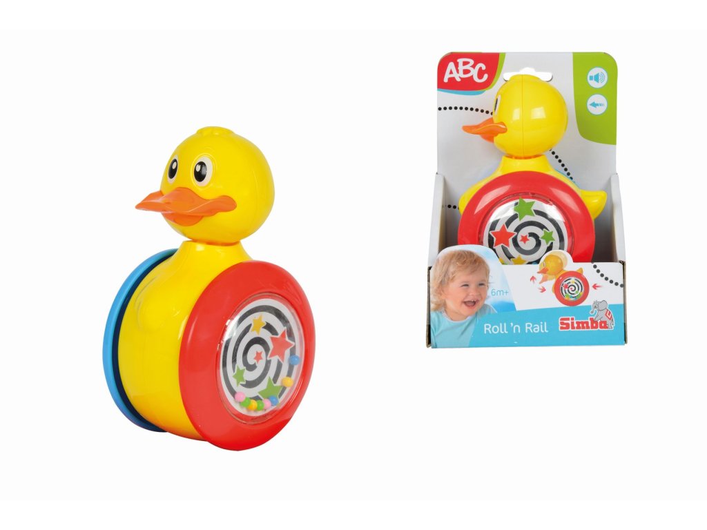 Kachnička ve veselých barvách při pohybu vpřed hýbe hlavou a zároveň chrastí malými kuličkami, které jsou umístěny v kolečkách.