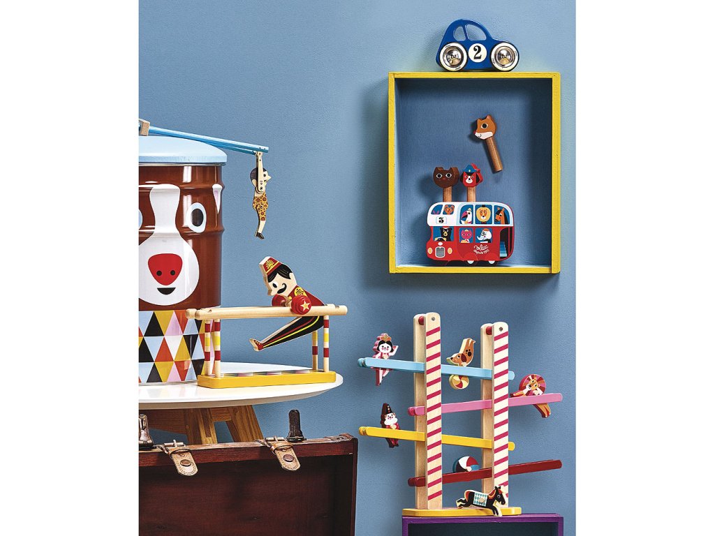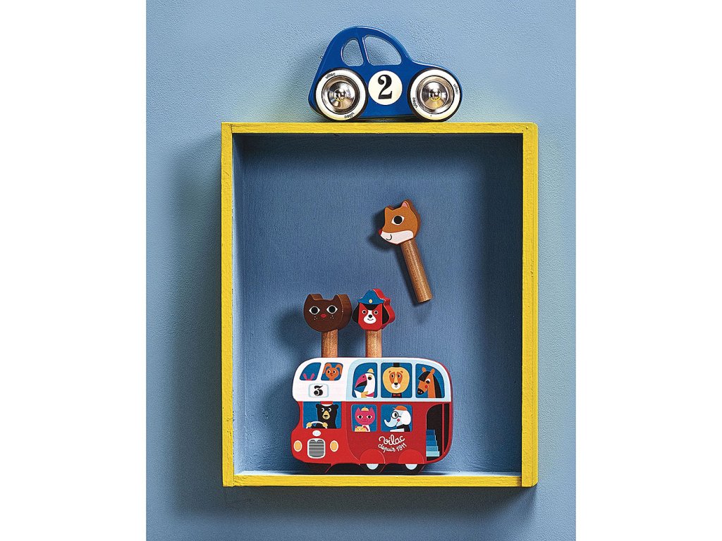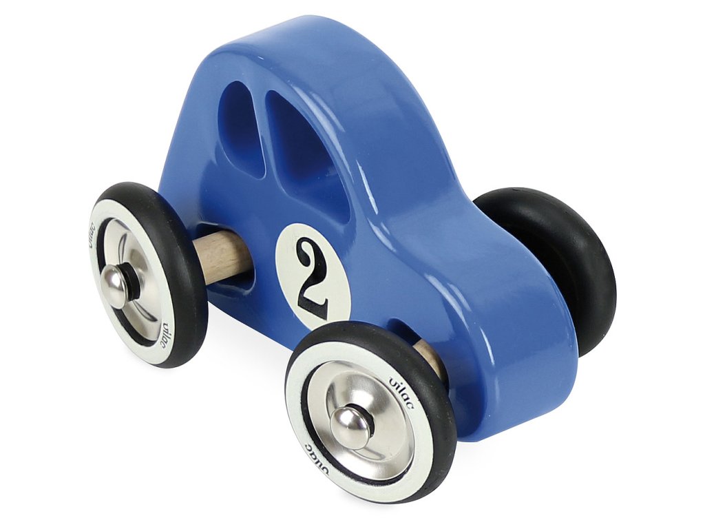 Modré autíčko vyrobené z lakovaného dřeva s kovovými pogumovanými koly. Autíčko je speciální v tom, že zatáčí doleva a doprava díky speciálnímu řešení nápravy. Vyrobeno ve Francii. Hlavní vlastnosti: vyrobeno ve Francii