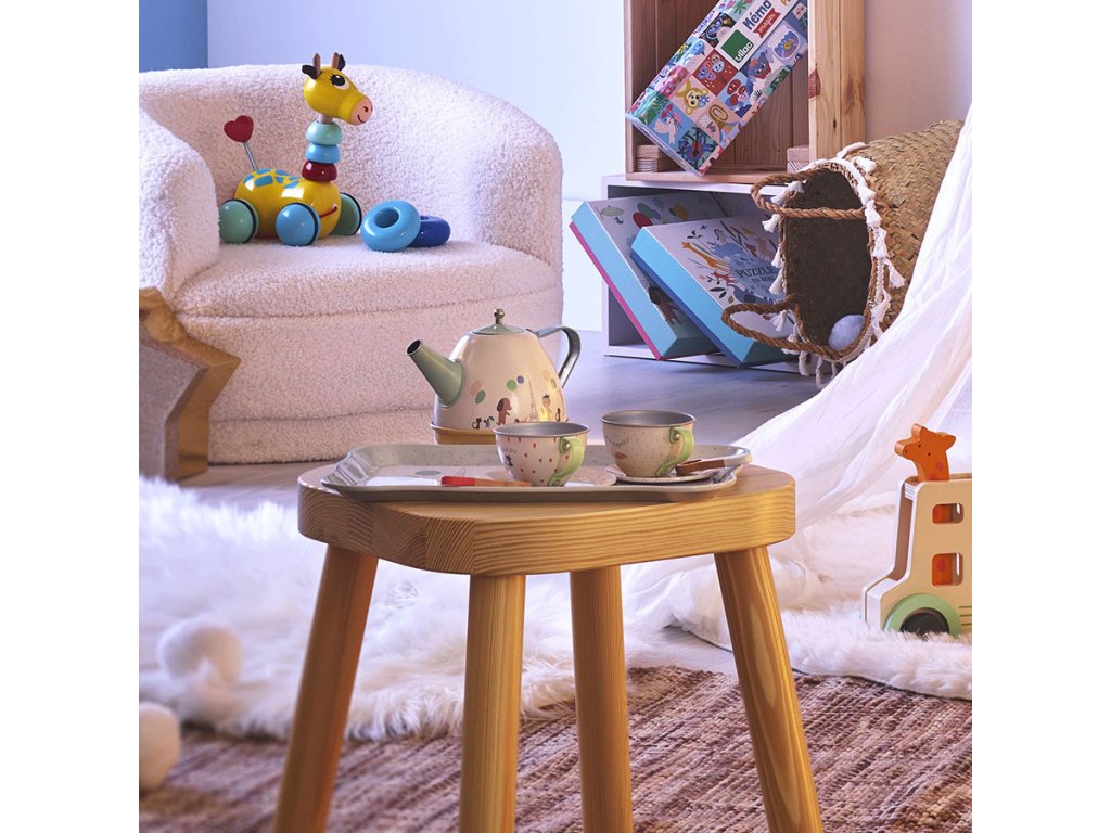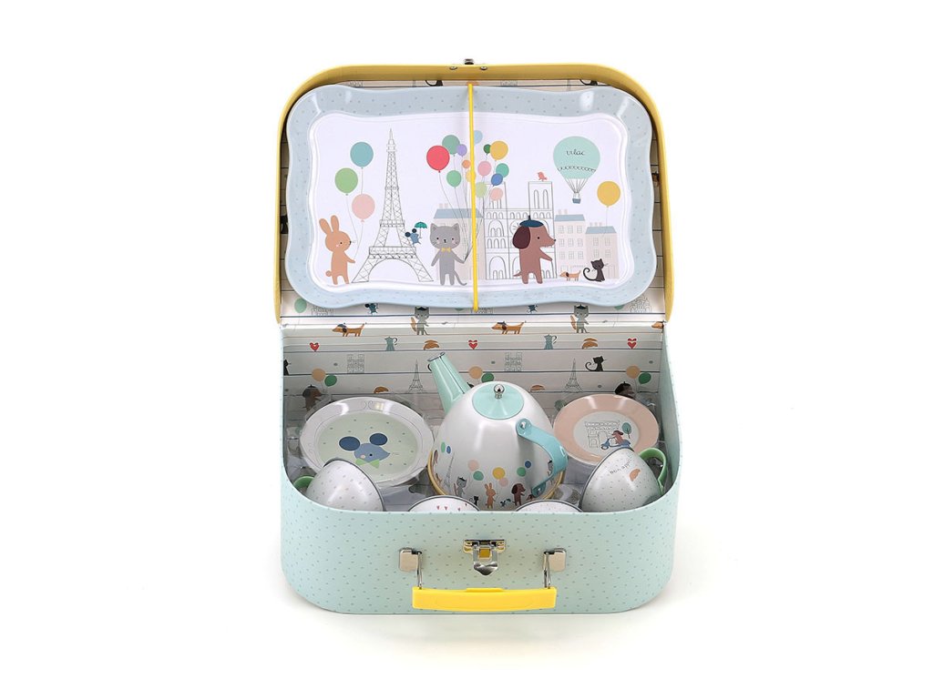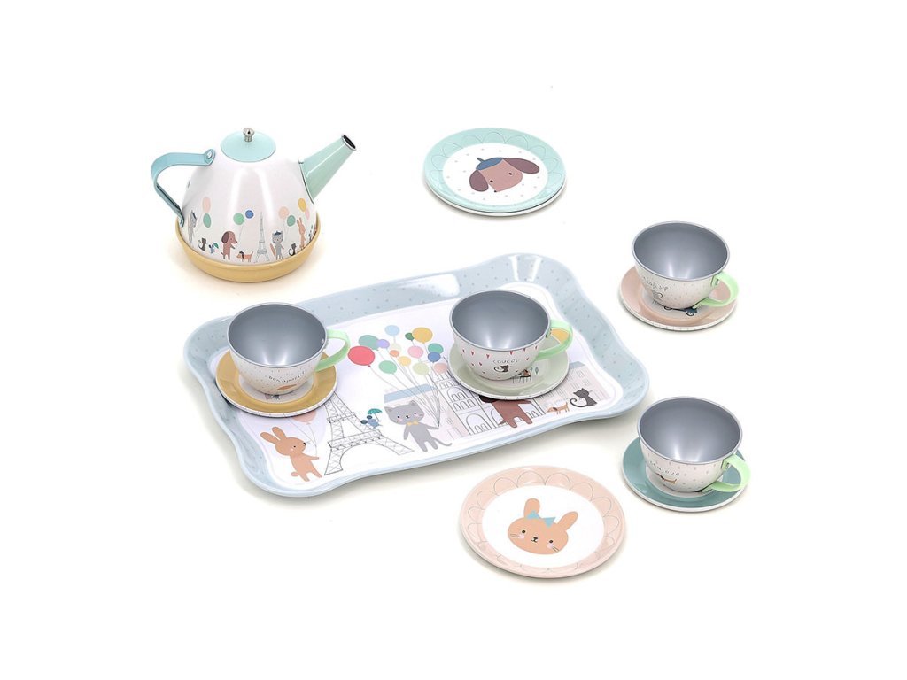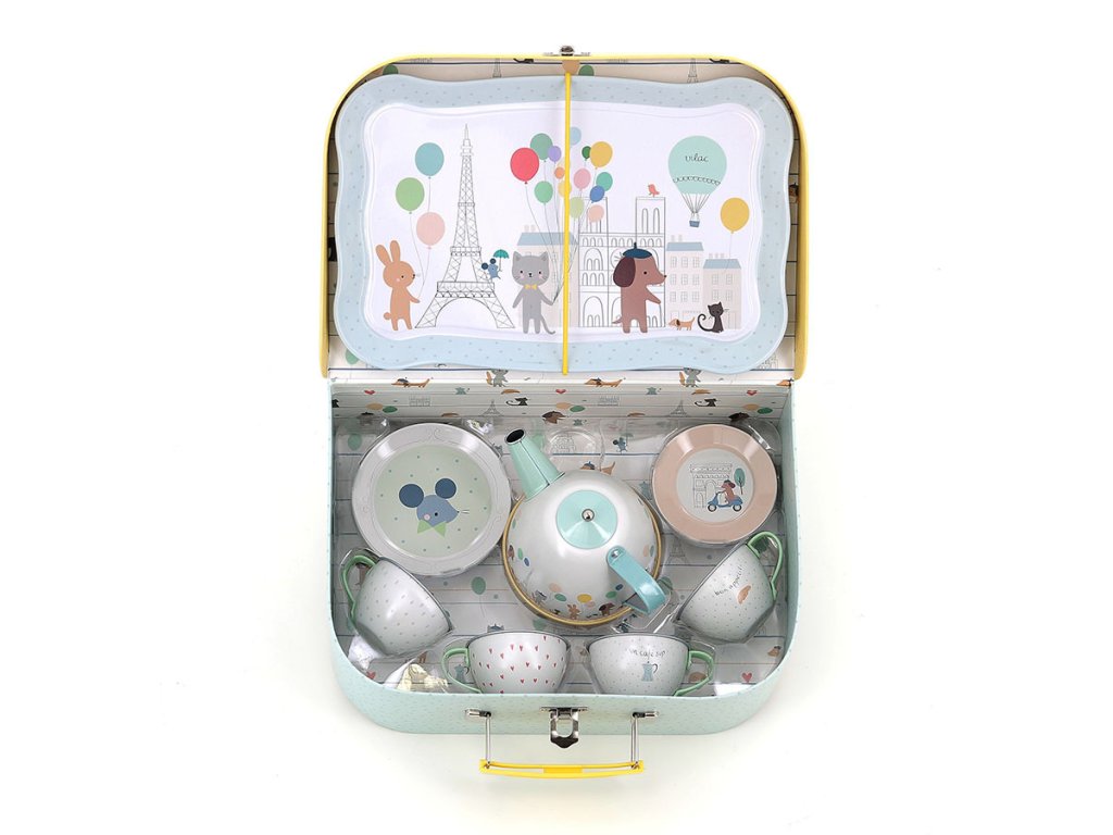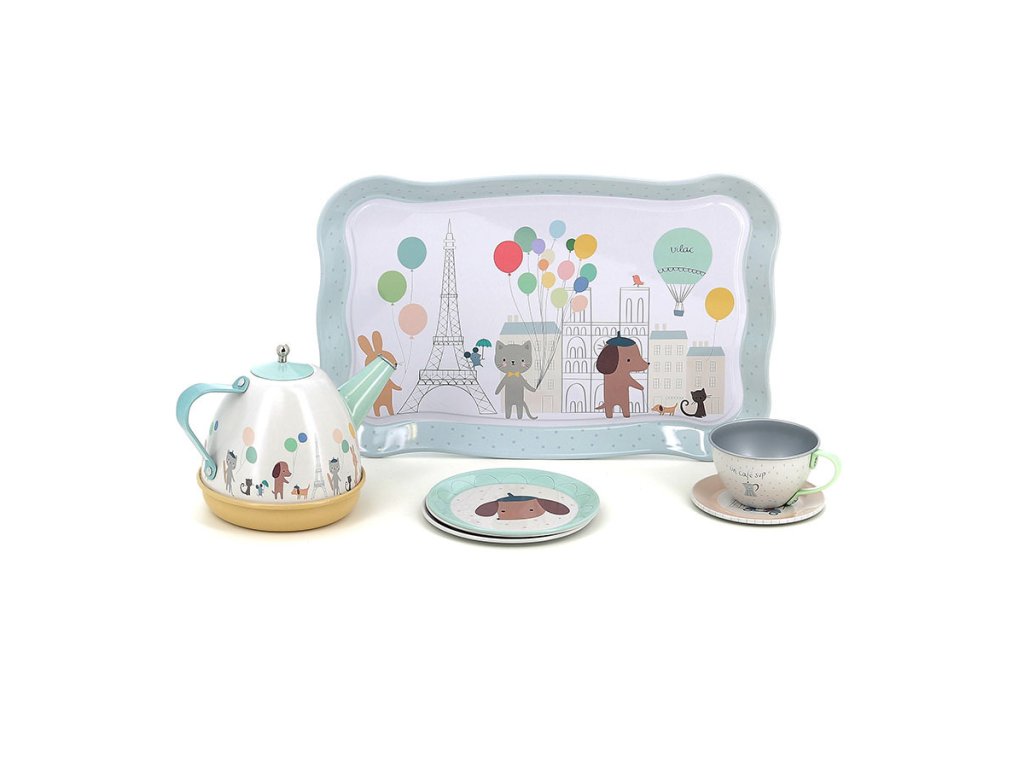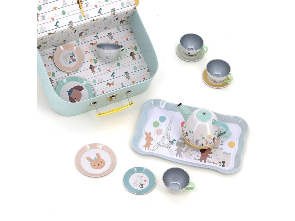 Pomocí kouzelného čajového servisu si děti rozvíjejí fantazii, učí se pravidlům servisu a společenskému chování. Konvička je vybavena natahovacím hracím strojkem, který při jejím naklonění spustí jemnou narozeninovou melodii „Hodně štěstí, zdraví“. 14 dílná soupravu ilustrovala Sarah Betz jemnými barvami evokujícími město Paříž. Je vyrobena z lehkého a velmi odolného kovu. Skvělý způsob, jak podpořit kreativní a nápadité hraní. Díky praktickému kufříku je také skvělým společníkem na cesty. Tato hračka nevyžaduje baterie, hudbu hraje mechanická hrací skříňka, která se navíjí pomocí klíče připevněného pod konvičkou. Hlavní vlastnosti: tácek, konvička a 4 šálky s podšálkypřehrává melodii „Hodně štěstí, zdraví“praktický kufřík pro snadné přenášeníodolné,lehké kovové provedenídesign Sarah Betz