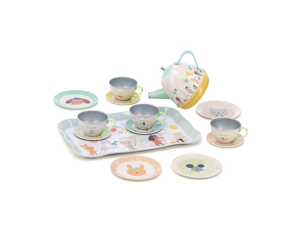 Pomocí kouzelného čajového servisu si děti rozvíjejí fantazii, učí se pravidlům servisu a společenskému chování. Konvička je vybavena natahovacím hracím strojkem, který při jejím naklonění spustí jemnou narozeninovou melodii „Hodně štěstí, zdraví“. 14 dílná soupravu ilustrovala Sarah Betz jemnými barvami evokujícími město Paříž. Je vyrobena z lehkého a velmi odolného kovu. Skvělý způsob, jak podpořit kreativní a nápadité hraní. Díky praktickému kufříku je také skvělým společníkem na cesty. Tato hračka nevyžaduje baterie, hudbu hraje mechanická hrací skříňka, která se navíjí pomocí klíče připevněného pod konvičkou. Hlavní vlastnosti: tácek, konvička a 4 šálky s podšálkypřehrává melodii „Hodně štěstí, zdraví“praktický kufřík pro snadné přenášeníodolné,lehké kovové provedenídesign Sarah Betz