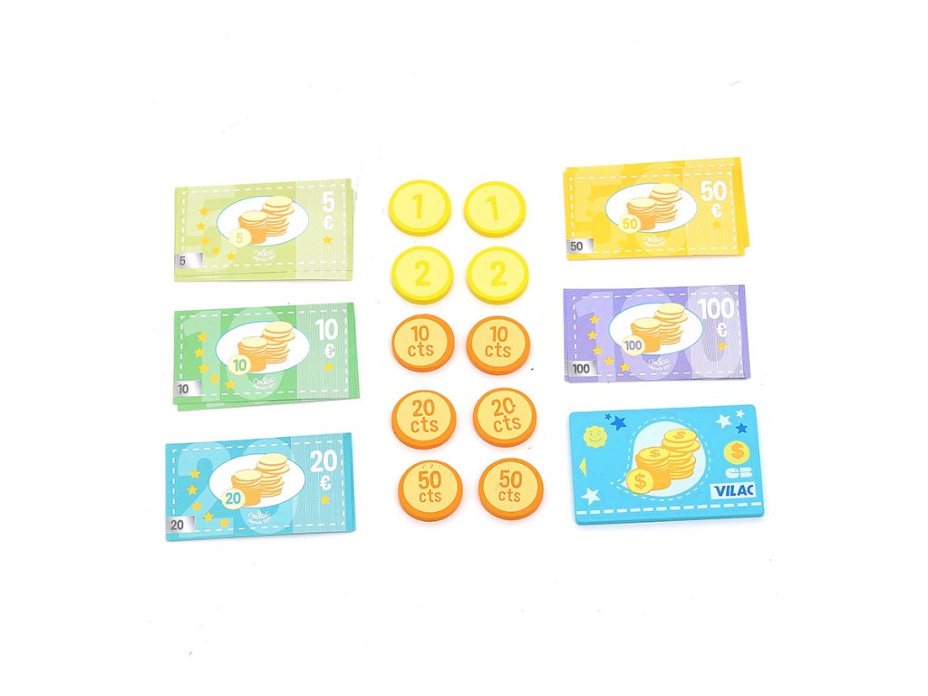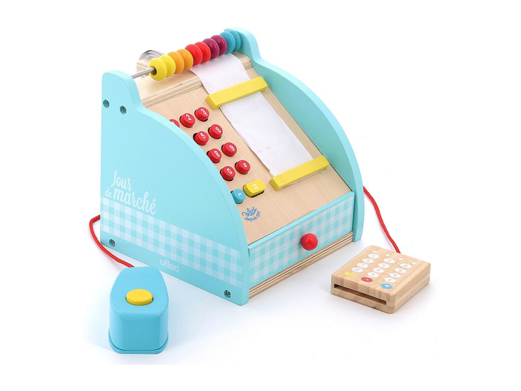Dřevěná pokladna s šuplíkem na peníze, počítadlem a bankovním terminálem. Obsahuje také klasické zvukové tlačítko a funkční numerickou klávesnici. Mezi doplňky patří bankovky a mince. Hlavní vlastnosti: rozvíjí komunikační dovednosti a sociální interakcifunkční prvky pokladny jako tlačítka a šuplík na penízevčetně příslušenství