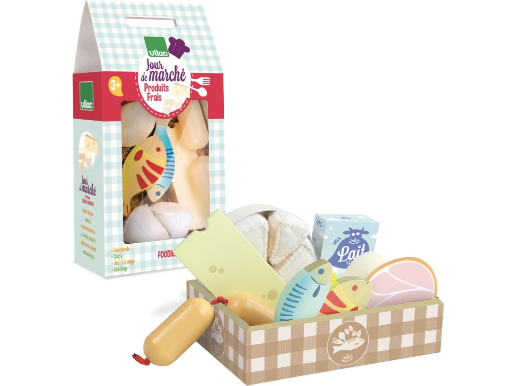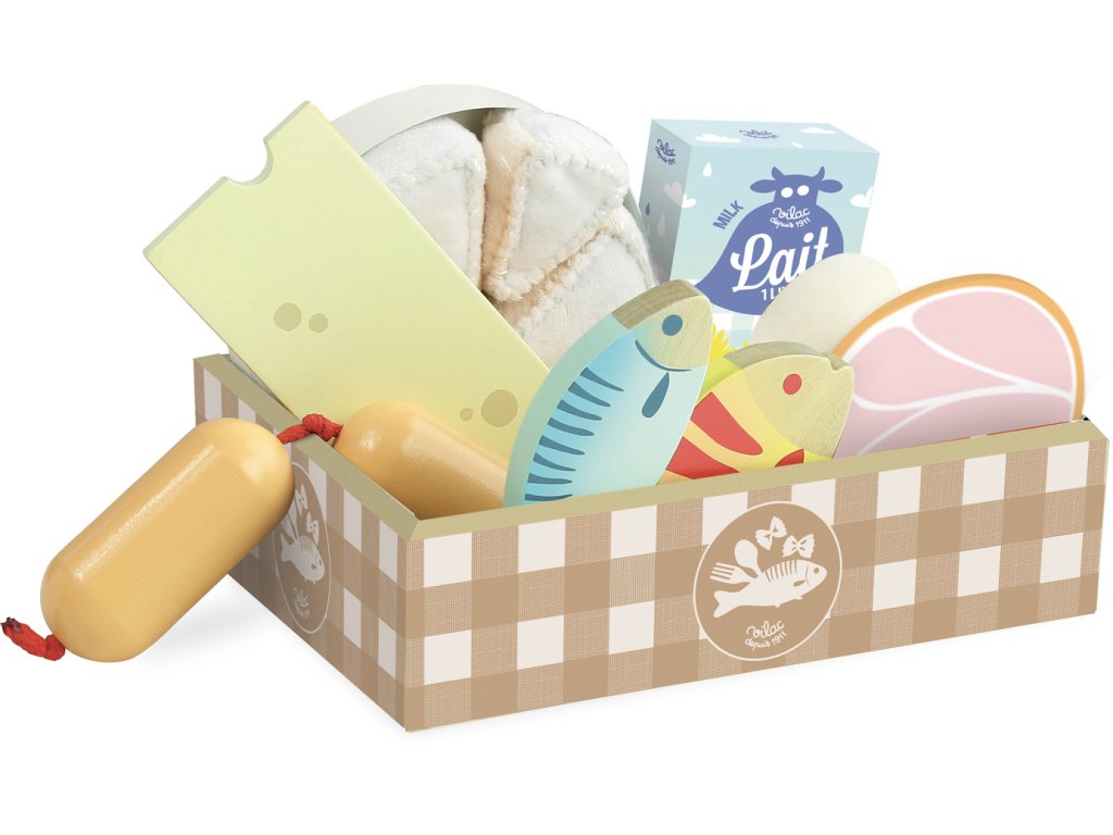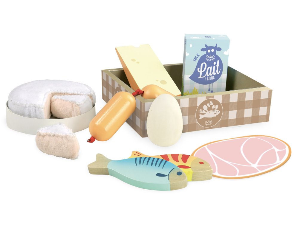 Pěkný lepenkový box obsahuje 2 ryby, plátek šunky, vejce, krabici mléka, sýr a špekáčky. Tento set je ideálním doplňkem do kuchyněk Vašich dětí, 11 dílná sada. Hlavní vlastnosti: vhodné do každé kuchyňkypotraviny vyrobené ze dřevaobsahuje 11 ks