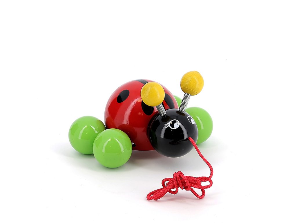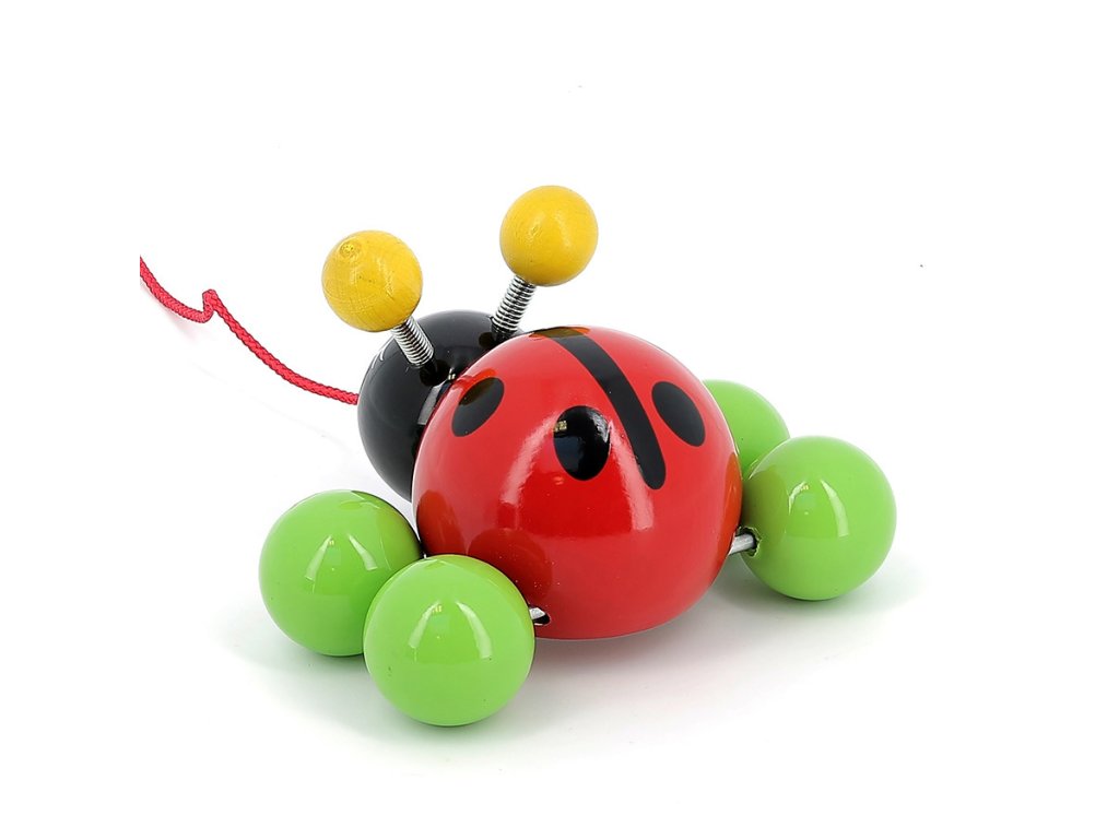 Dřevěná tahací beruška z lakovaného masivu, s tykadly na pružince. Ty se při tahání pohybují. Vyrobeno ve Francii. Hlavní vlastnosti: podporuje rovnováhu a koordinaci pohybůvyrobeno ve Francii