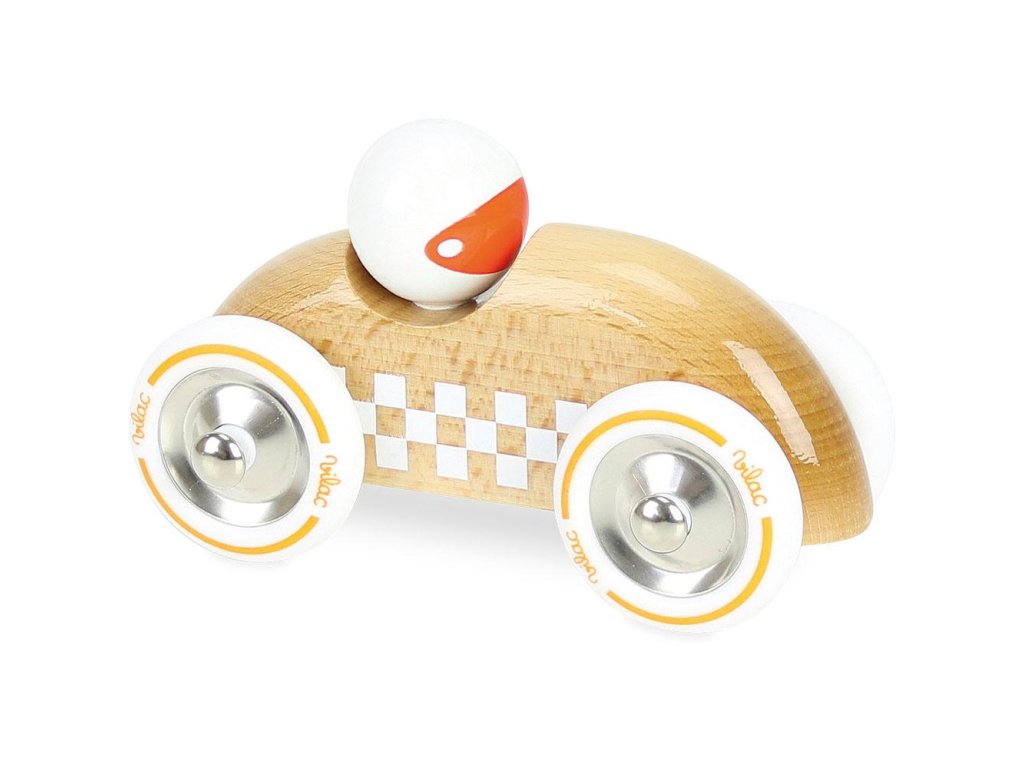 Závodní auto s jezdcem z lakovaného dřeva v přírodní barvě, s kovovými pogumovanými koly. Je vhodné jak ke hraní tak jako dekorace do pokojů dětí či dospělých. Vyrobeno ve Francii. Hlavní vlastnosti: vyrobeno ve Francii