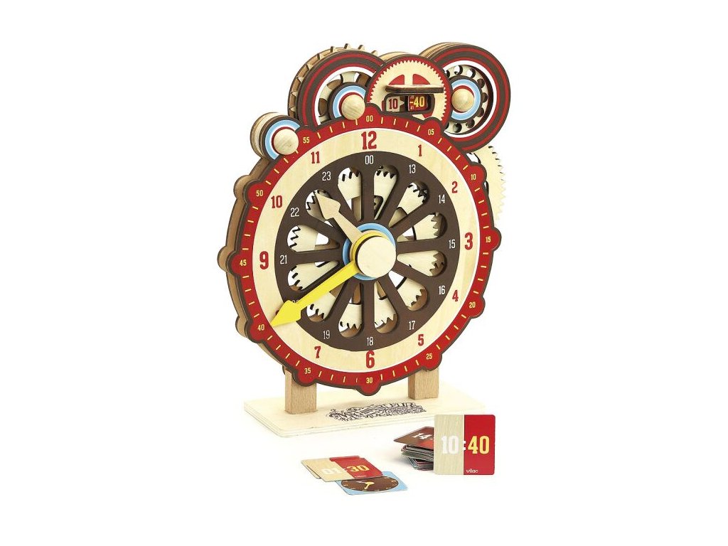 Dřevěné hodiny pomohou dětem naučit se poznávat čas a chápat jeho pojetí. Pro přehlednost jsou vybaveny i kotoučovým číselníkem imitujícím digitální ukazatel, který usnadňuje orientaci na hlavním ciferníku. Obě ručičky i pohyblivý číselník jsou vzájemně propojeny převody, ukazatele spolu časově korespondují a mechanika odpovídá skutečným hodinám. Balení obsahuje sadu vzorových karet, které lze využít k procvičování. Hodiny lze postavit i zavěsit na stěnu. Čas je pro děti velmi abstraktním pojmem. Roky, roční období, měsíce, dny, hodiny, minulost, přítomnost a budoucnost. Existuje tolik pojmů, které se děti musí naučit během několika let, a to ani pořádně nerozumí tomu, jak fungují a nechápou jejich logiku. Jednou z výzev pro vaše dítě je umět poznat čas na analogových hodinách nebo hodinkách a na digitálním displeji. Proto firma Vilac vyrobila tyto didaktické hodiny, díky kterým se děti naučí hodiny poznávat. Jak? Tak, že se dozví, jak vypadá hodinový strojek. Hlavní vlastnosti: dvojice různých ukazatelů pro usnadnění orientacereálný převod minuty/hodiny, převod mezi oběma ukazatelisada vzorových karet k procvičovánívyrobeno ekologicky, šetrně k prostředí Dokumentace: Návod ke hře Didaktické hodiny (CZ)Návod ke hře Didaktické hodiny (SK)
