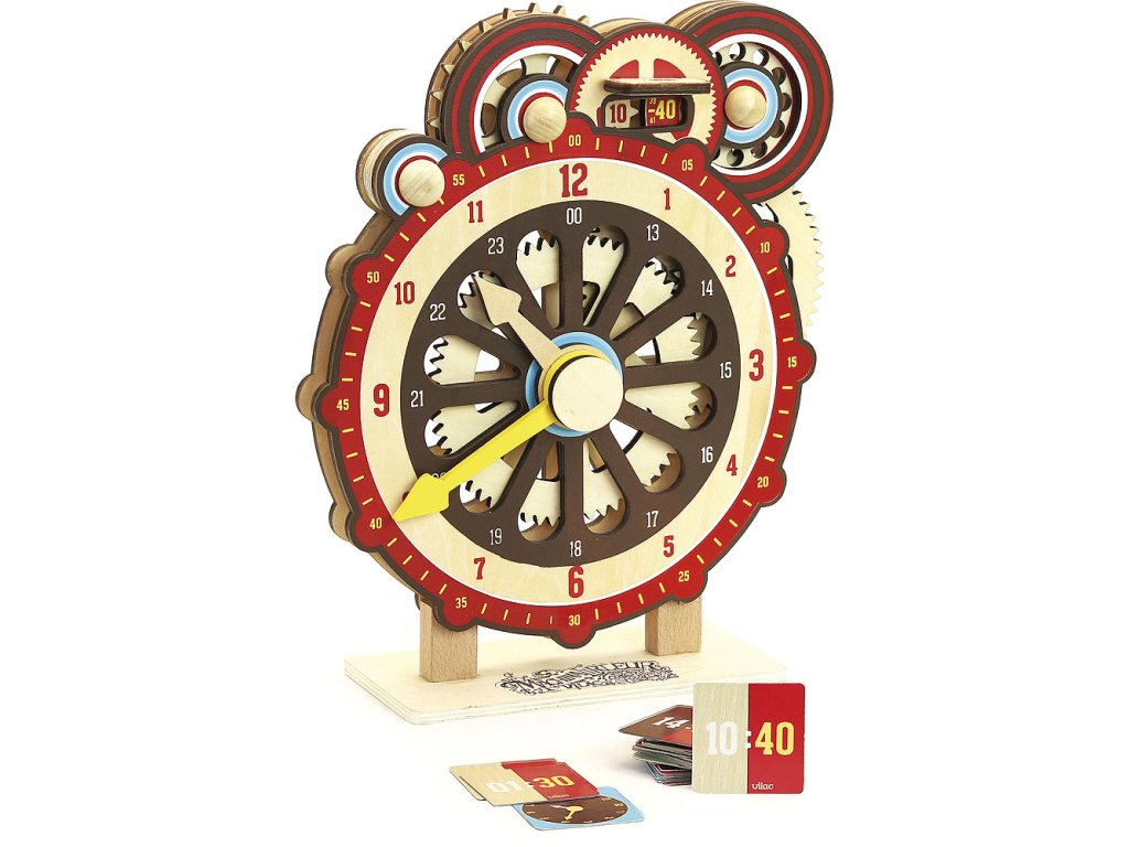 Dřevěné hodiny pomohou dětem naučit se poznávat čas a chápat jeho pojetí. Pro přehlednost jsou vybaveny i kotoučovým číselníkem imitujícím digitální ukazatel, který usnadňuje orientaci na hlavním ciferníku. Obě ručičky i pohyblivý číselník jsou vzájemně propojeny převody, ukazatele spolu časově korespondují a mechanika odpovídá skutečným hodinám. Balení obsahuje sadu vzorových karet, které lze využít k procvičování. Hodiny lze postavit i zavěsit na stěnu. Čas je pro děti velmi abstraktním pojmem. Roky, roční období, měsíce, dny, hodiny, minulost, přítomnost a budoucnost. Existuje tolik pojmů, které se děti musí naučit během několika let, a to ani pořádně nerozumí tomu, jak fungují a nechápou jejich logiku. Jednou z výzev pro vaše dítě je umět poznat čas na analogových hodinách nebo hodinkách a na digitálním displeji. Proto firma Vilac vyrobila tyto didaktické hodiny, díky kterým se děti naučí hodiny poznávat. Jak? Tak, že se dozví, jak vypadá hodinový strojek. Hlavní vlastnosti: dvojice různých ukazatelů pro usnadnění orientacereálný převod minuty/hodiny, převod mezi oběma ukazatelisada vzorových karet k procvičovánívyrobeno ekologicky, šetrně k prostředí Dokumentace: Návod ke hře Didaktické hodiny (CZ)Návod ke hře Didaktické hodiny (SK)