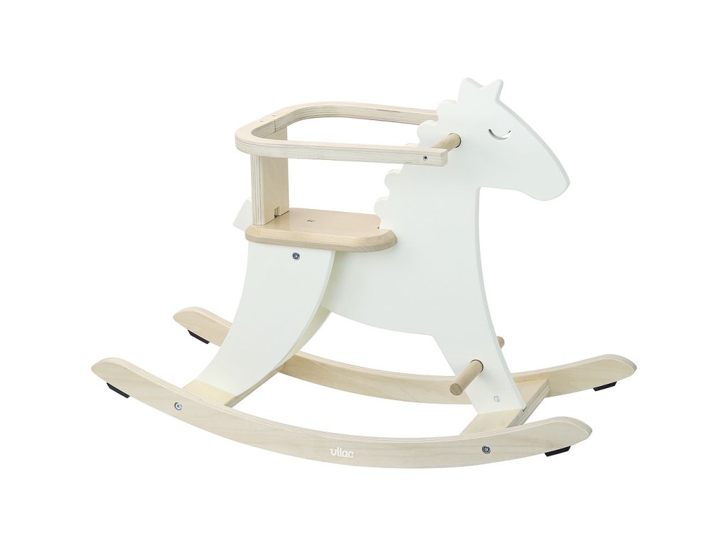 Dřevěný houpací kůň v bílé barvě s opěradlem. Opěradlo je možno dle libosti sundat. Hračky Vilac mají značku francouzské agentury ADEME, to znamená, že tyto dřevěné hračky jsou vyráběny ekologicky. Šetří životní prostředí, neznečišťují půdu, vodu a vzduch, neplýtvají energiemi. Již více než 100 let plní značka Vilac dětské sny. Společnost Vilac sídlí hluboko v srdci pohoří Jura, obklopena horami, jezery a lesy. Tato francouzská společnost vyrábí od roku 1911 dřevěné hračky v klasickém, starodávném stylu s moderními barvami a vzory. Hračky Vilac jsou jedinečné, nikdy nevyjdou z módy a dokáží okouzlit všechny generace. Vilac pomáhá utvářet dětskou představivost svými radostnými ilustracemi či dizajny a reinterpretací klasických hraček, které se jen tak neopotřebují. Děti dostávají na Vánoce a narozeniny spousty hraček, většina z nich je však nezaujme na dlouhou dobu, láska k hračce se nenaplní. Dřevěné hračky Vilac vzbuzují vášeň i o 50 let později, když jako dospělí náhodou najdete v podkroví hračky, které jste jako děti milovali. Vilac již 100 let propojuje děti s hračkami, které si oblíbí a váží si jich. A proč je děti tak milují? To zůstává tajemstvím firmy Vilac.