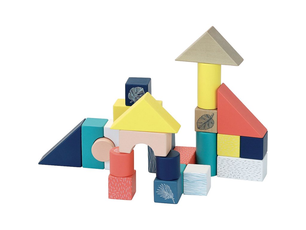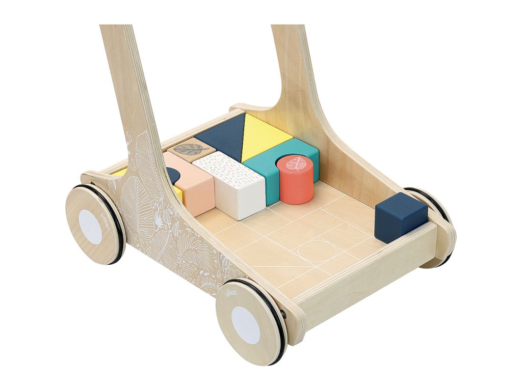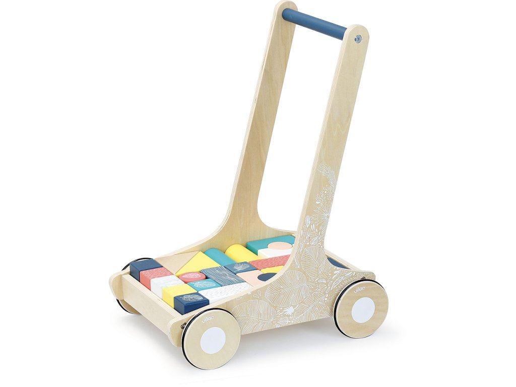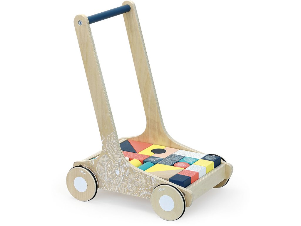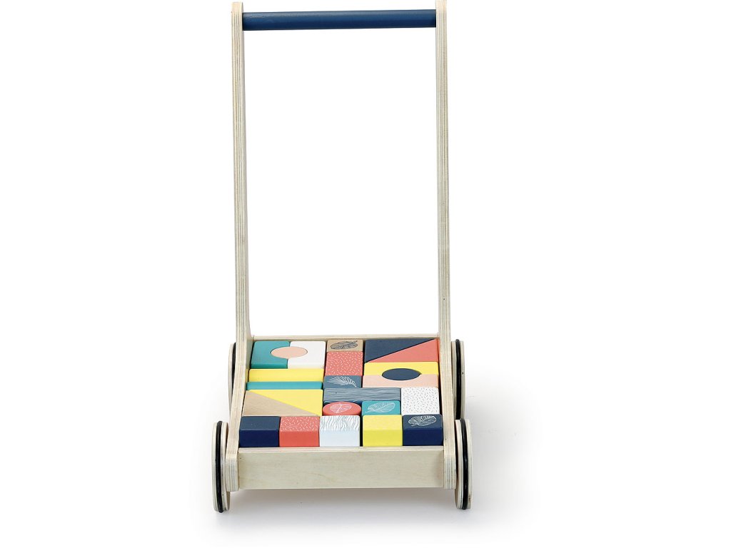 Dřevěný vozík s modrým madlem, bílou ilustrací a pogumovanými kolečky veze 24 kostek barevných i přírodních v různých tvarech. Děti podpoří při chůzi, hra s kostkami zase rozvine jejich prostorovou představivost. Vhodné od 12 měsíců. Hlavní vlastnosti: obsahuje 24 kostekmoderní barevný designvozíček a chodítko v jednompomáhá v rozvoji rovnováhy a motoriky dětí