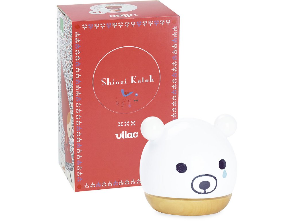 Pěkná hrací skříňka ve tvaru medvídka, ilustroval Shinzi Katoh. Smutný polární medvěd je zřejmě inspirován globálním oteplováním a táním ledovců. Hraje melodii „Home on the Range“ – tradiční westernová folková píseň. Vyrobeno ve Francii. Hlavní vlastnosti: vyrobeno ve Franciidesign Shinzi Katoh Shinzi Katoh je návrhář, tvůrce, malíř a spisovatel s více než 40 letou kariérou, japonský umělec známý fanoušky po celém světě pro své roztomilé, veselé vzory. Shinzi je známý především svými kousky Zakka (japonsky: vše, co dokáže vylepšit domov), ale je také autorem a ilustrátorem více než 25 knih. Patří sem dětské knihy a ilustrovaná poezie pro dospělé. V reakci na obavy o životní prostředí vytvořil postavu ledního medvěda Sorabear, aby vzdělával a zvyšoval povědomí ohledně globálního oteplování. Nadace Sorabear byla v roce 2010 oceněna cenou japonského ministra životního prostředí a v roce 2012 získala první ocenění Solar Energy Award. V posledních letech se Shinzi více zaměřuje na malbu, pořádá výstavy v muzeích a obchodních domech po celém Japonsku. Tyto výstavy také nabízejí řadu zábavných workshopů a příležitostí ke vzdělávání, s důrazem na zapojení dětí do umění. Workshop malování živě, ve kterém děti malují a pracují společně po boku s Shinzim na velkém obraze, se konává v Pařížském butiku Colette, Aiči Triennale v Nagoji, v muzeích Himedži a Kasugai.