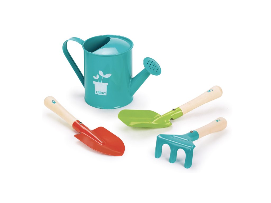 Přenosný set malých zahradníků. Tento velmi kvalitní zahradnický set obsahuje lopatku, hrábě, rýč a konvičku. Taška se dá jednoduše vyprat, nářadí omýt vodou. Nářadí je vyrobeno z masivního dřeva a kovu, velikostně tak akorát pro dětské ruce. Pojďme na zahradu! Hlavní vlastnosti: ideální velikost pro dětirozvíjí motoriku a vztah k příroděvyrobeno z kovu, dřevěná násada