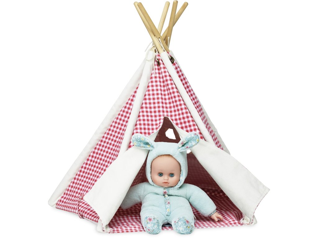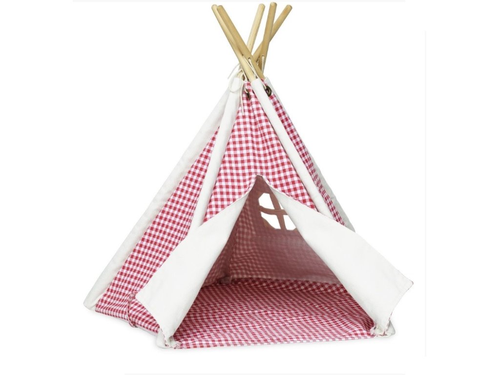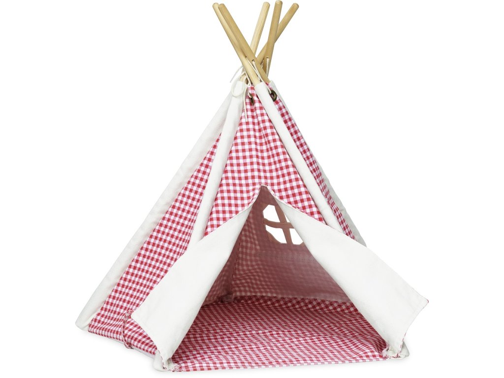 Krásné kárované týpí v mini provedení, ideální pro panenky. Dřevěný základ s textilním přehozem je jednoduché složit. Textil je červeno-bílý. Hlavní vlastnosti: týpí pro panenkypevná konstrukce