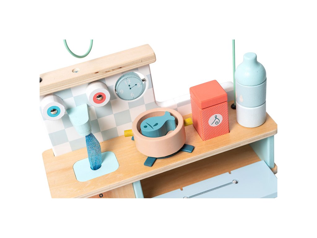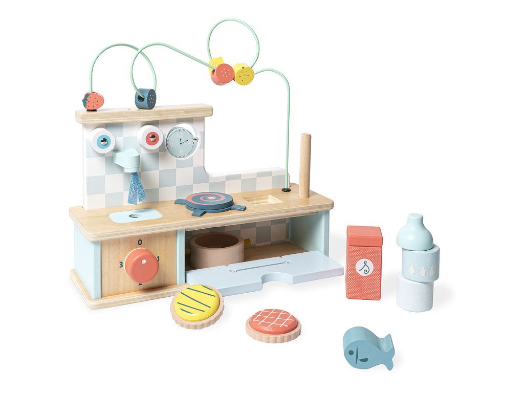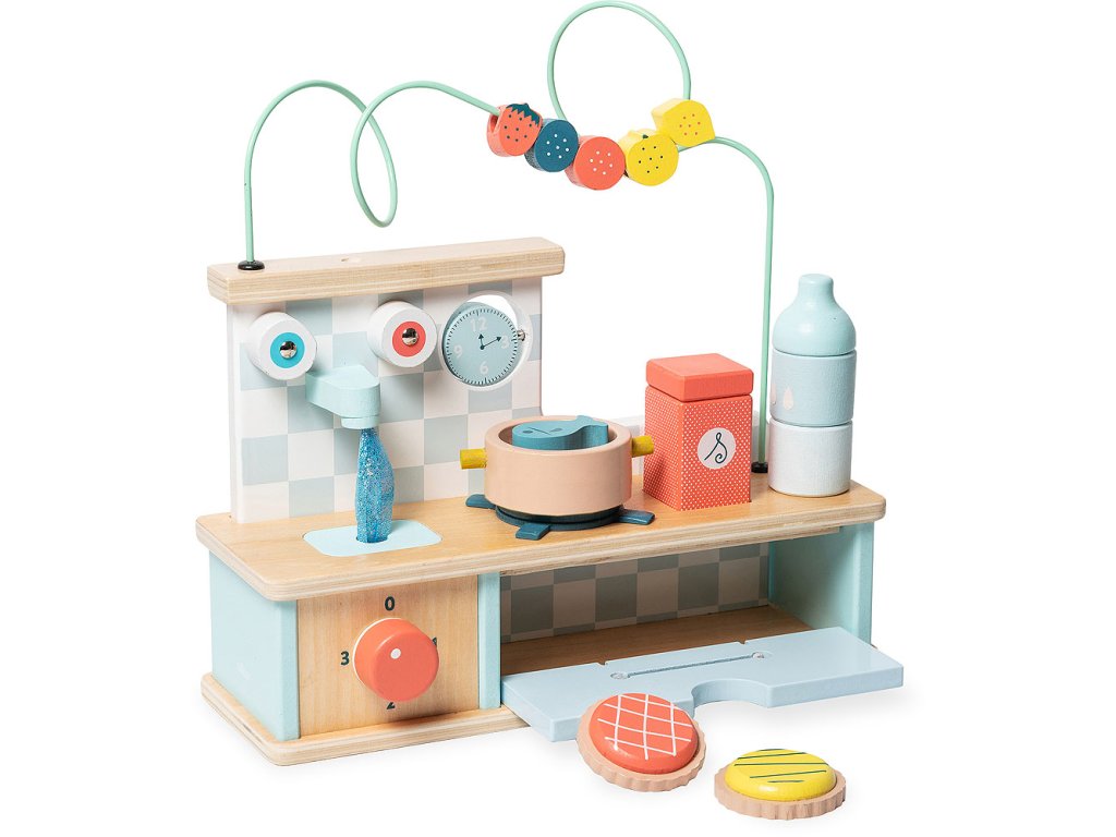 Tato dřevěná multifunkční motorická kuchyň je určena pro ty nejmenší a nabízí spoustu překvapení a rozmanitých aktivit! Labyrint s ovocem, otáčecí hodiny, stohovatelnou láhev a solničku. Umístěte ryby do hrnce a uvařte je jako dospělí. Poté otevřete dvířka trouby, abyste do trouby umístili koláče, otočením knoflíku začněte péct. Hmmm, voní to tak dobře! Pokud chcete umýt nádobí, stačí otevřít kohoutky. Tato motorická kuchyňka byla navržena týmem specialistů firmy Vilac pro smyslový rozvoj dětí. Hlavní vlastnosti: interaktivní motorické prvkycvakající knoflíky, otvírací troubavhodné pro děti od 18 měsícůpro smyslový rozvoj dětí