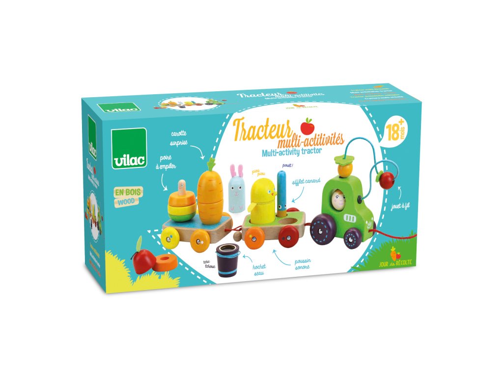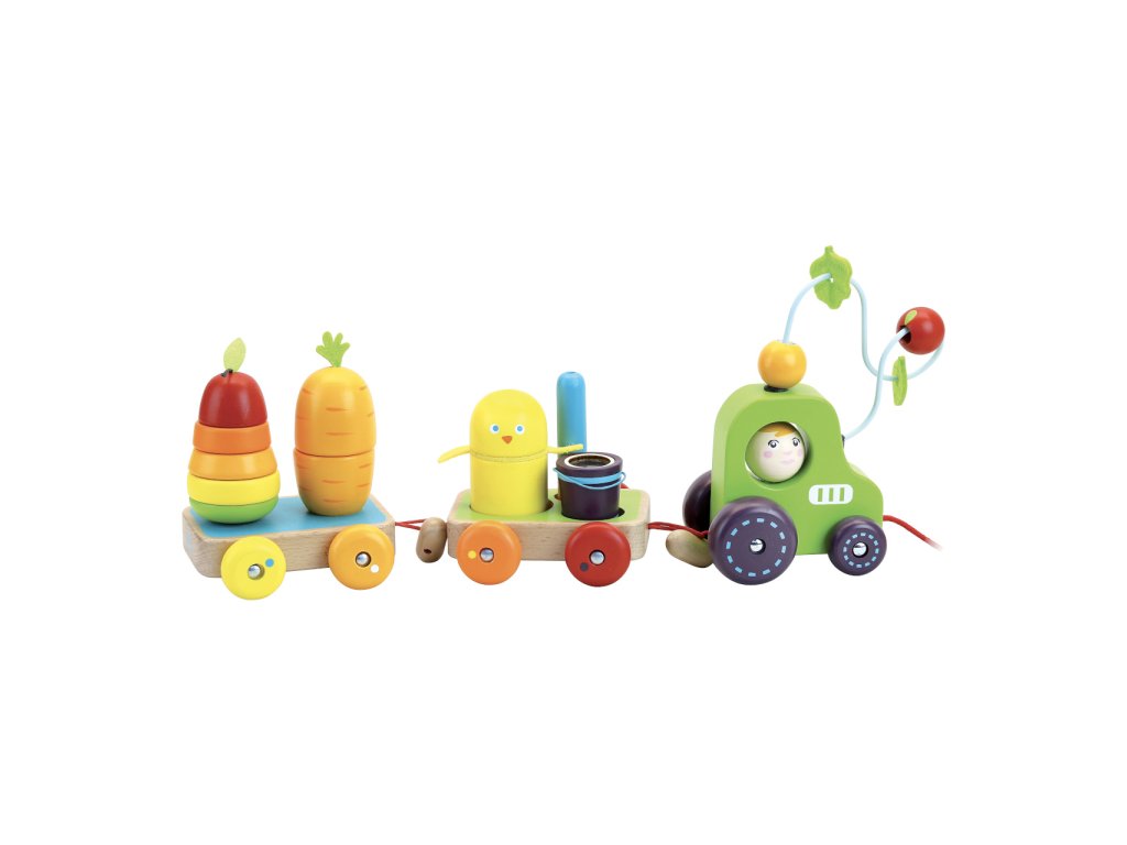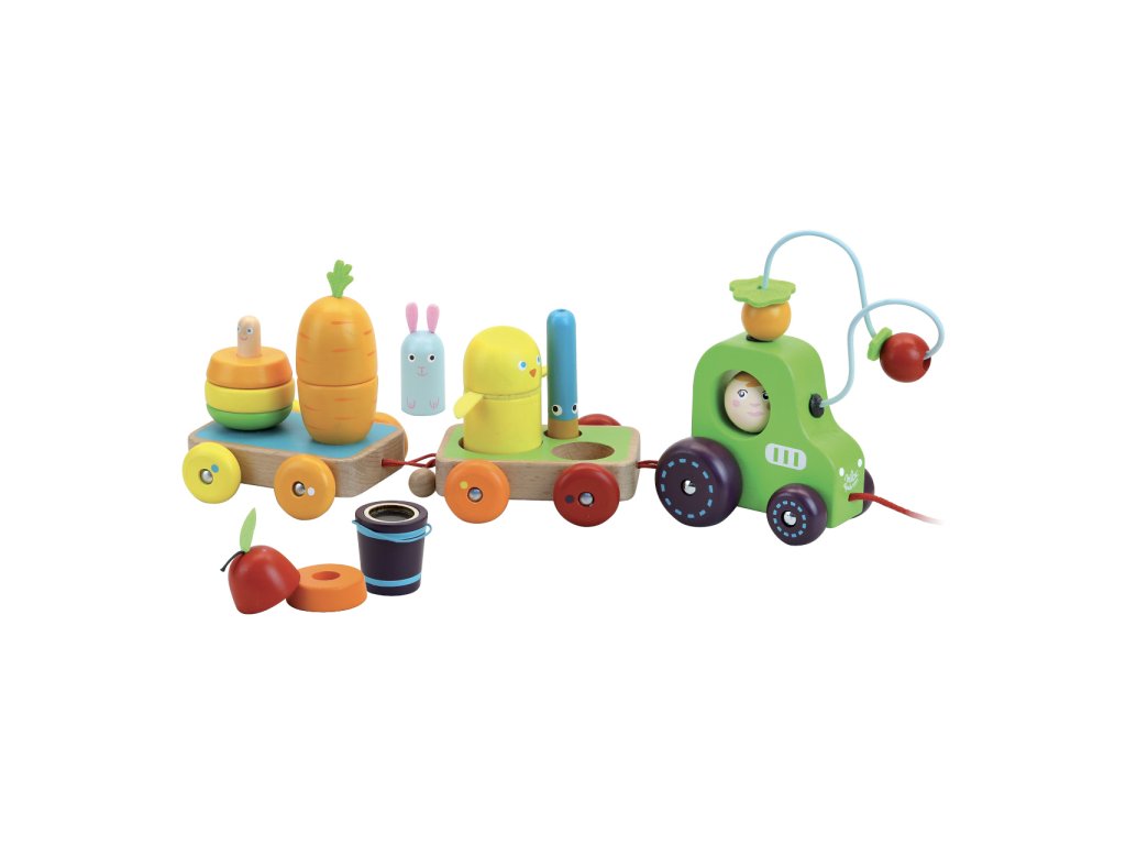 Skládací hruška ukrývá červíka, králík je schovaný v mrkvi, ptáčci pípají, kbelík s kukuřicí štěrká jako rumba koule a traktor má posuvné korálky na drátku ve tvaru ovoce. Hračka, která rozvine představivost, motoriku a zvídavost Vašich dětí. Hlavní vlastnosti: vysoká variabilitavyrobeno ekologicky, šetrně k životnímu prostředí