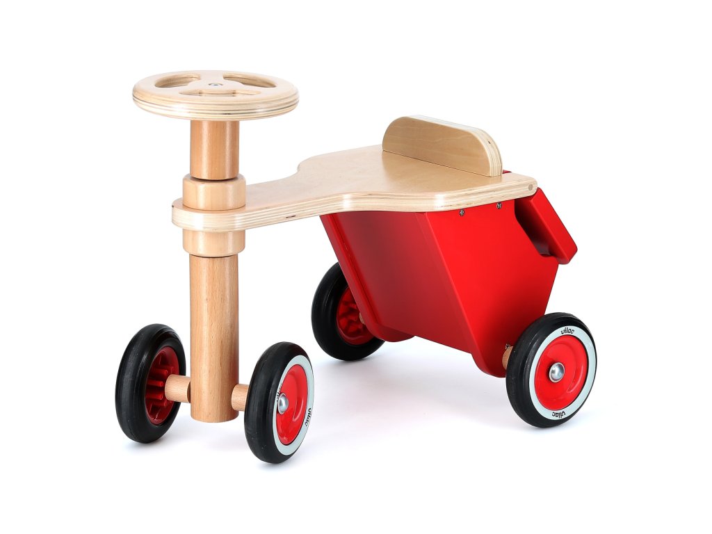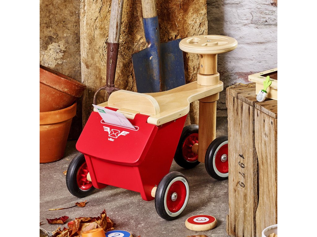 Každý listonoš bude tiše závidět! Atraktivní a propracované odrážedlo je v zadní části vybaveno kufříkem s odklopným víkem a štěrbinou, kam lze vhazovat například první malůvky. Nabízí ovšem dostatek prostoru, aby mohli nejmenší na cestu s sebou vzít i oblíbené plyšové zvířátko. Vozítko vyniká výjimečně robustní konstrukcí využívající silnou překližku i díly z masivního dřeva. Úhel otáčení jeho volantu je omezen tak, aby byla zaručena stabilita a nehrozil pád dítěte. Plastová kola jsou opatřena odolnými pneumatikami, které tlumí hluk a zároveň zlepšují jízdní vlastnosti. Bezpečnost odrážedla byla i laboratorně ověřena, Vaši nejmenší tak mohou bez obav vyrazit za dobrodružstvím. Výrobek vyžaduje montáž, dodáváno s obrázkovým návodem k sestavení. Hlavní vlastnosti: úložný kufříktichý a kultivovaný chodjedinečný design a zpracovánírobustní a stabilní dřevěná konstrukce