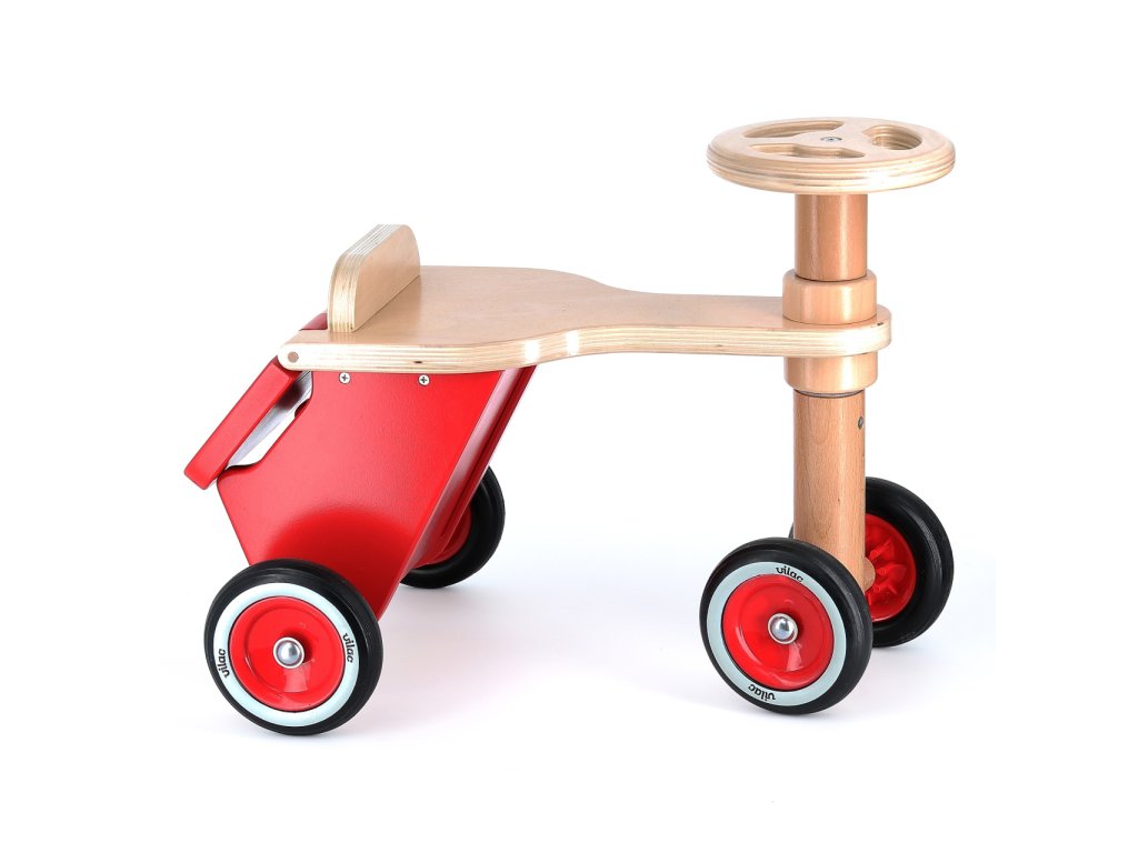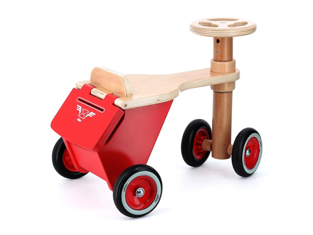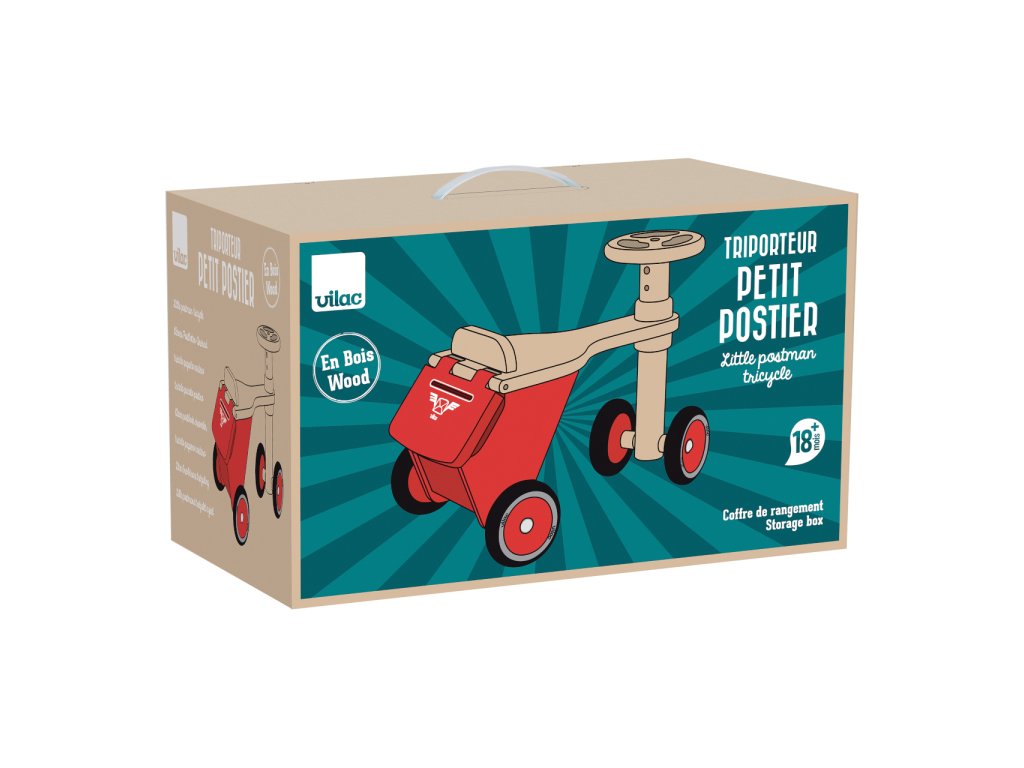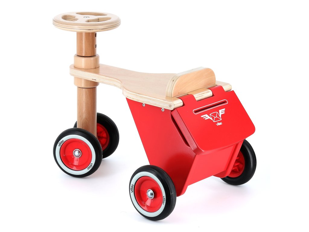 Každý listonoš bude tiše závidět! Atraktivní a propracované odrážedlo je v zadní části vybaveno kufříkem s odklopným víkem a štěrbinou, kam lze vhazovat například první malůvky. Nabízí ovšem dostatek prostoru, aby mohli nejmenší na cestu s sebou vzít i oblíbené plyšové zvířátko. Vozítko vyniká výjimečně robustní konstrukcí využívající silnou překližku i díly z masivního dřeva. Úhel otáčení jeho volantu je omezen tak, aby byla zaručena stabilita a nehrozil pád dítěte. Plastová kola jsou opatřena odolnými pneumatikami, které tlumí hluk a zároveň zlepšují jízdní vlastnosti. Bezpečnost odrážedla byla i laboratorně ověřena, Vaši nejmenší tak mohou bez obav vyrazit za dobrodružstvím. Výrobek vyžaduje montáž, dodáváno s obrázkovým návodem k sestavení. Hlavní vlastnosti: úložný kufříktichý a kultivovaný chodjedinečný design a zpracovánírobustní a stabilní dřevěná konstrukce