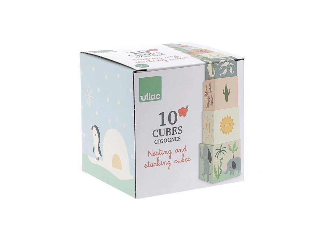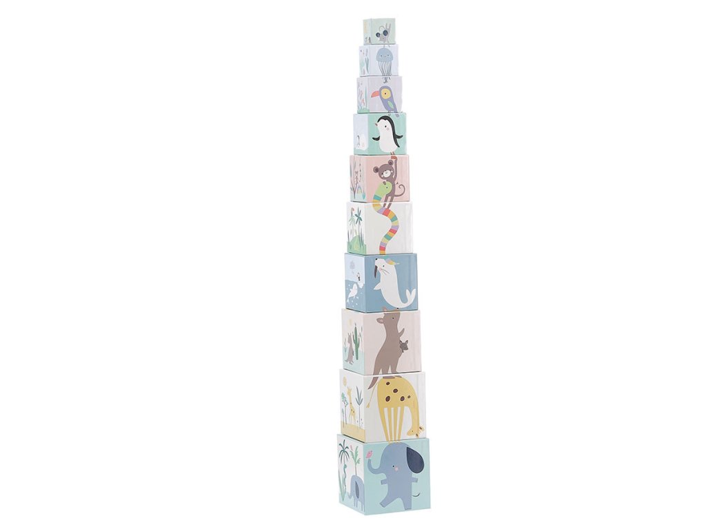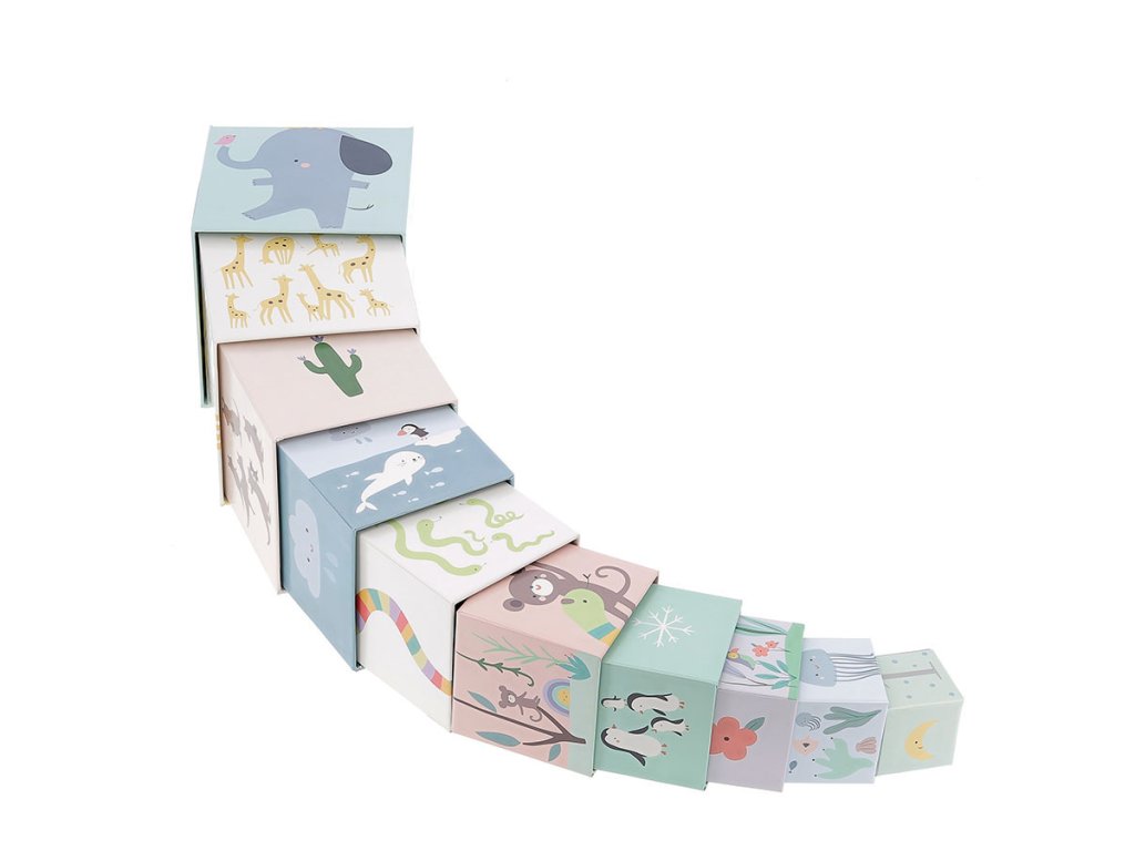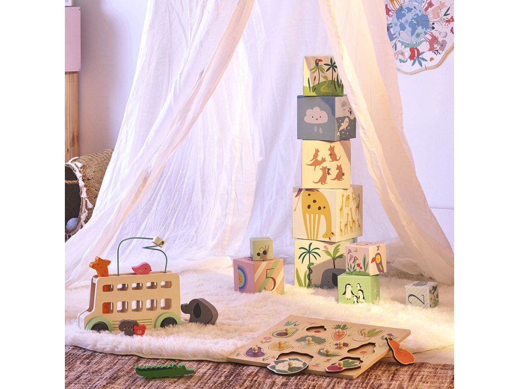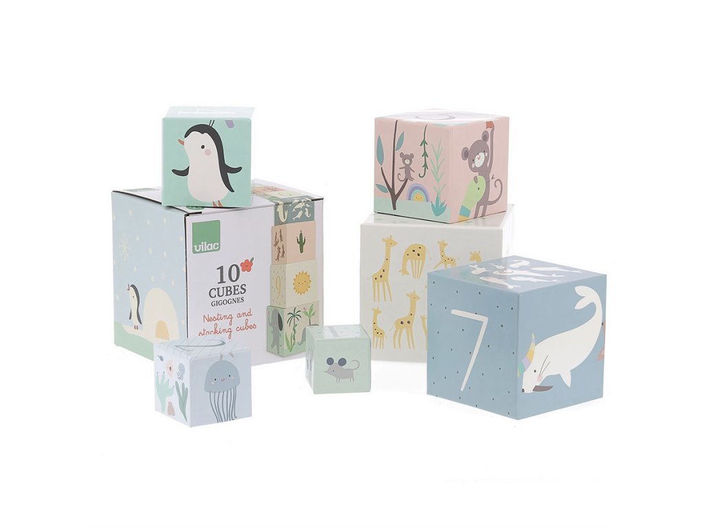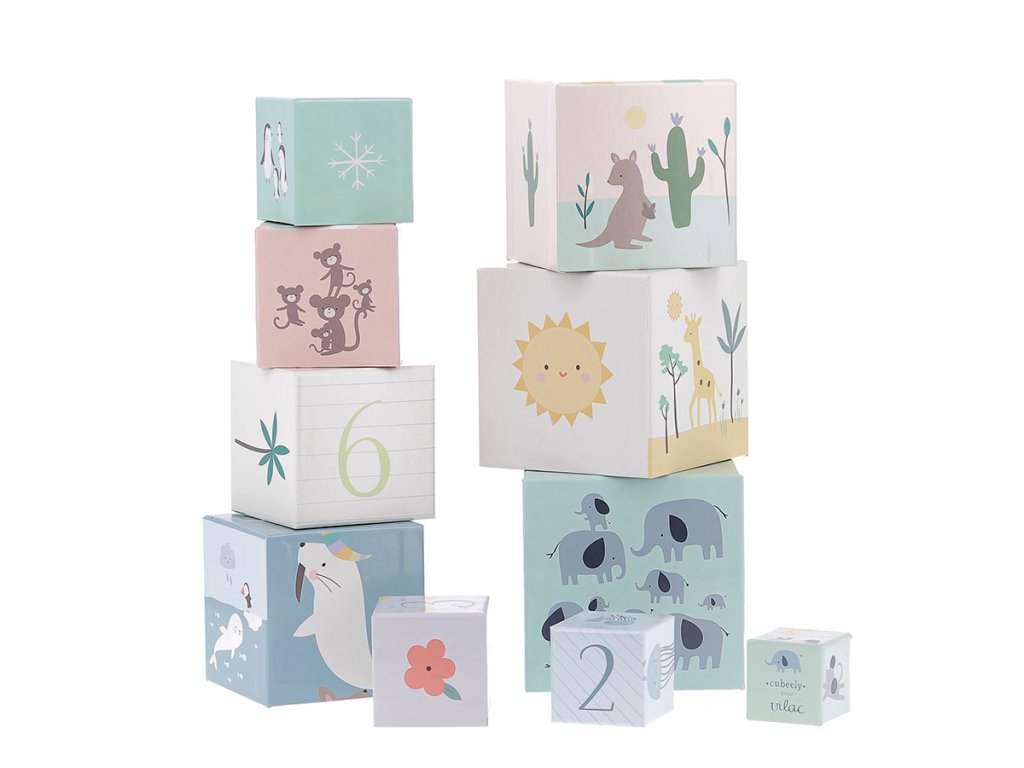 10 ks kartonových skládacích kostek s krásnými ilustracemi od designérky Sarah Betz. Děti od 2 let se při hraní naučí jak skládat kostky, tak rozpoznávat zvířata, barvy a také počítat. Kostky naskládané na sebe, od největší po nejmenší, tvoří věž o výšce přibližně 87 cm. Rozvíjí koordinaci ruka-oko, a tím celkovou zručnost dětí. Vyžaduje vizuální pozornost a schopnost koncentrace. Tato první sada kostek podpoří vývoj vašeho drobečka a bude se vyvíjet s ním. Zpočátku jednoduchá manipulační hra se časem promění ve stavební hru, později hru na učení čísel. Hlavní vlastnosti: 10 ks pevných kartonových kostekvyrobeno ekologicky, šetrně k životnímu prostředírozvíjí koordinaci ruka-oko a celkovou zručnost dětídesign Sarah Betz Sarah Betz vyrostla v Německu, nyní však tvoří ve Francii. Založila zde vlastní značku „Little Cube“. Ani se jí nezdálo o tom, že by mohla svou vášeň pro kreslení a psaní proměnit v úspěšnou kariéru. Už od mala si kreslila a čmárala všude možně, od školních sešitů po stěny dětského pokoje. Rodiče ji v jejím zájmu podporovali a jako dítě si s nimi užila mnoho představivé hry. Vyrůstala v blízkosti lesa, takže byla její tvorba od mala inspirována přírodou. Na procházkách v lese sbírala přírodní materiály, z kterých pak tvořila šperky, také je zakomponovala do svých maleb a knih. Po vystudování grafického a komunikačního designu v Německu a Švýcarsku se přestěhovala do Francie, zde se učila jazyk a pomalu nastartovala svou kariéru v designu. Své vlastní ilustrační studio „Little Cube“ založila v roce 2013.