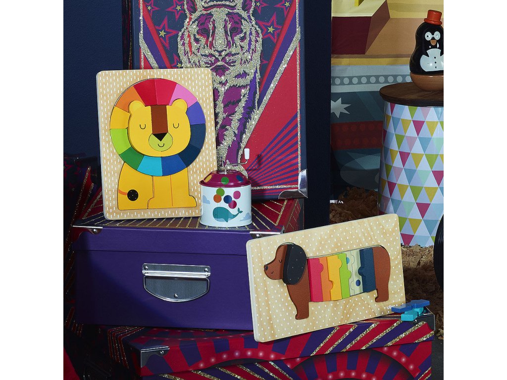 Vkládací puzzle s motivem lva s barevnou hřívou. Na základní desce jsou místa pro vložení dílků barevně rozlišeny, aby děti mohly snadněji vložit dílek na správné místo. Učí se tak nejen jemné motorice, ale také rozpoznávání barev a tvarů. Malé děti tak mohou snadno uchopit robustní dřevěné kousky a vytvořit tak svého malého lvího kamaráda. Hlavní vlastnosti: obsahuje 17 dílkůrozvíjí senzomotorické vlastnosti dětídesign Andy Westface Andy Westface je ilustrátor žijící a působící v Hongkongu. Svou prací se snaží zprostředkovat silné pocity a jasné myšlenky za pomoci jednoduchých tvarů, kompozic i barevnosti. Typickými prvky jeho děl jsou zvířata a duha, které si oblíbil pro jejich čistotu, upřímnost a schopnost vzbuzovat radost.