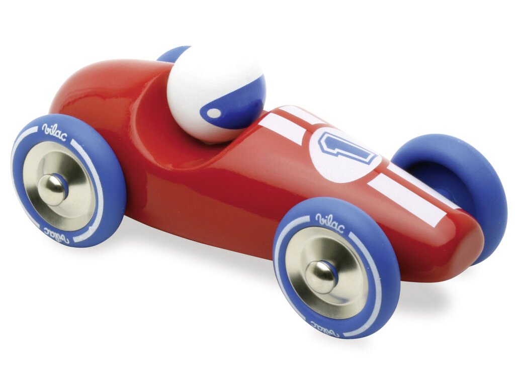 Červené závodní auto vyrobeno z lakovaného dřeva s kovovými pogumovanými koly. Je vhodné jak ke hraní tak jako dekorace do pokojů dětí či dospělých. Vyrobeno ve Francii. Hlavní vlastnosti: vyrobeno ve Francii