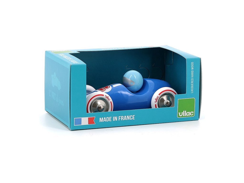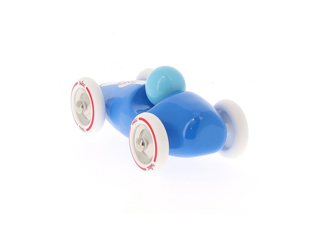 Modré závodní auto vyrobeno z lakovaného dřeva s kovovými pogumovanými koly. Je vhodné jak ke hraní tak jako dekorace do pokojů dětí či dospělých. Vyrobeno ve Francii. Hlavní vlastnosti: vyrobeno ve Francii