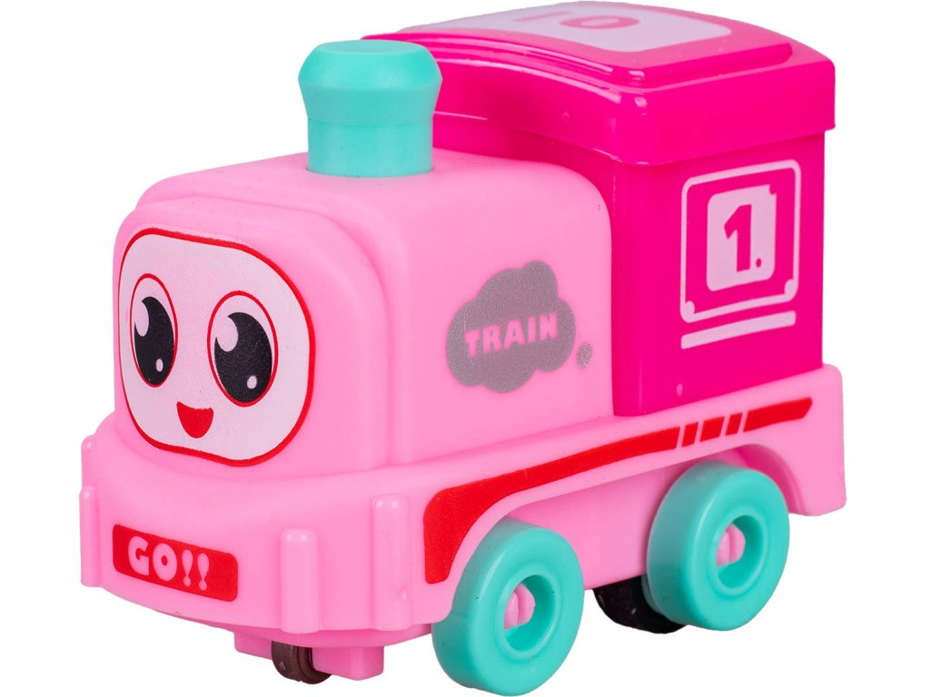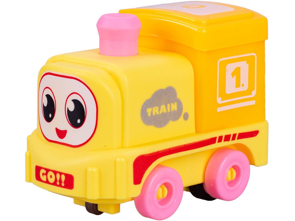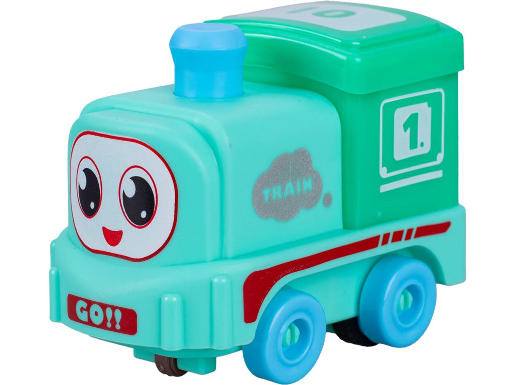 Baby barevný vláček - lehká plastová mašinka, lokomotiva s očima, s pohonem na setrvačník, pro nejmenší děti, pro miminko. Velikost 9cm. 4 barevné varianty.