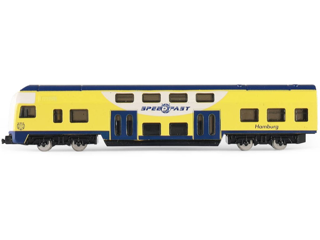 Regionální německý žluto-modrý vlak, kovový model 1:48, volný chod, vlaková souprava z kovu a plastu - 1 díl, velikost 16cm.