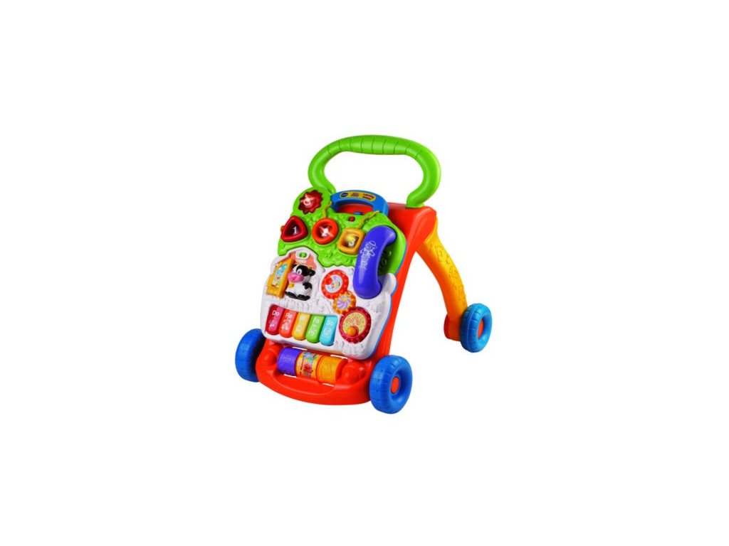 VTECH chodítko je součástí série hraček vyvinutých tak, aby rostly s dítětem od doby, kdy začnou sedět až do doby stabilní chůze. Nejdříve si mohou hrát s odnímatelným panelem na podlaze. Poznávají zvířátka, barvy, hudbu, tvary i čísla. Jakmile povyrostou, pak připnutý, důvěrně známý panel jim při chůzi dodává pocit bezpečí. Interaktivní panel chodítka nabízí 2 varianty hry, které lze libovolně přepínat pomocí posuvného tlačítka. První varianta nabízí možnost podvědomého učení a poznávání. Varianta druhá je více zaměřena na hudební cítění a zábavu. Vtech chodítko představuje dítěti první zvířátka a jaké zvuky zvířátka dělají. Učí ho poznávat barvy, podvědomě učí počítání, čísla i základy správného hudebního vzdělávání. Učí poznávat tvary a rozvíjí koordinaci očí s rukama. Podporuje manuální zručnost dítěte a správný vývoj hrubé i jemné motoriky. Úžasná stabilita, perfektně tvarovaná rukověť chodítka společně s možností nastavení brzdění koleček dává dítěti výjimečný pocit bezpečí při prvních krůčcích. Skvělou zábavu plnou poznávání nabízí telefonní sluchátko, otočná ozubená kolečka nebo barevné piáno. Vhodné od 9 měsíců, pouze v českém jazyce.
