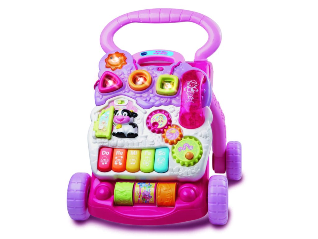 VTECH chodítko je součástí série hraček vyvinutých tak, aby rostly s dítětem od doby, kdy začnou sedět až do doby stabilní chůze. Nejdříve si mohou hrát s odnímatelným panelem na podlaze. Poznávají zvířátka, barvy, hudbu, tvary i čísla. Jakmile povyrostou, pak připnutý, důvěrně známý panel jim při chůzi dodává pocit bezpečí. Interaktivní panel chodítka nabízí 2 varianty hry, které lze libovolně přepínat pomocí posuvného tlačítka. První varianta nabízí možnost podvědomého učení a poznávání. Varianta druhá je více zaměřena na hudební cítění a zábavu. Vtech chodítko představuje dítěti první zvířátka a jaké zvuky zvířátka dělají. Učí ho poznávat barvy, podvědomě učí počítání, čísla i základy správného hudebního vzdělávání. Učí poznávat tvary a rozvíjí koordinaci očí s rukama. Podporuje manuální zručnost dítěte a správný vývoj hrubé i jemné motoriky. Úžasná stabilita, perfektně tvarovaná rukověť chodítka společně s možností nastavení brzdění koleček dává dítěti výjimečný pocit bezpečí při prvních krůčcích. Skvělou zábavu plnou poznávání nabízí telefonní sluchátko, otočná ozubená kolečka nebo barevné piáno. Vhodné od 9 měsíců.