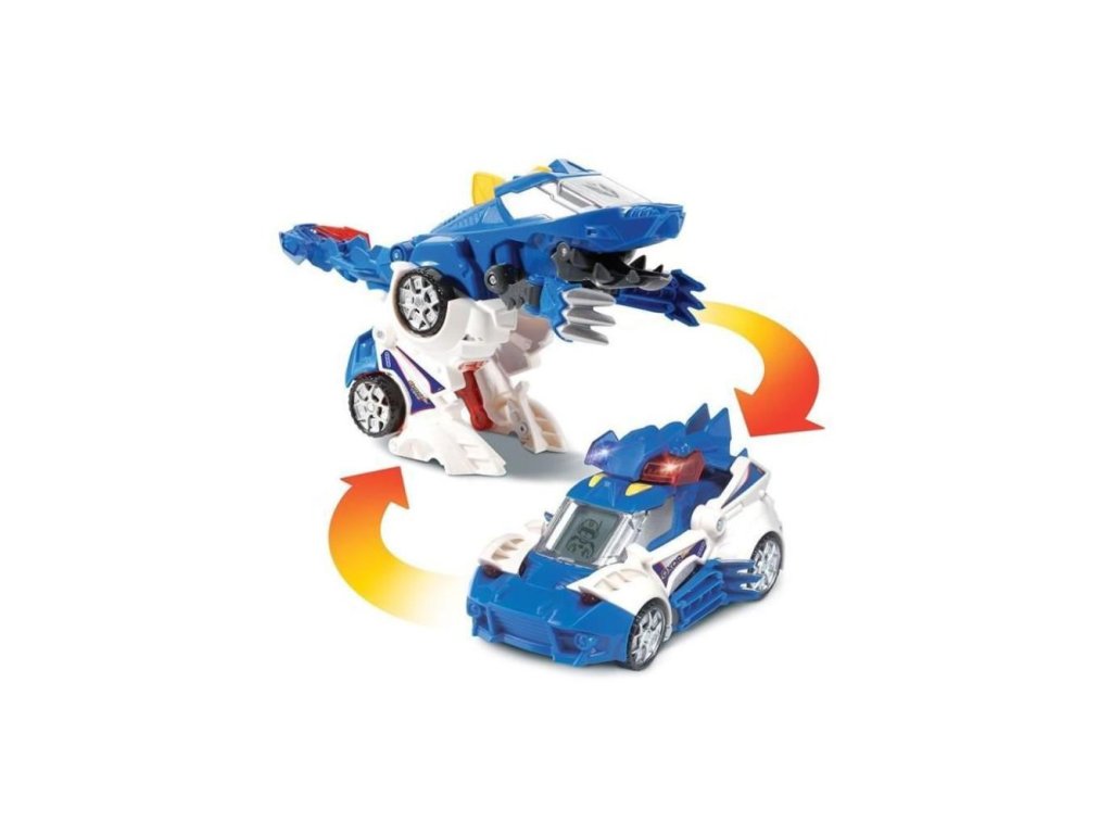 V okamžiku se tento zuřivý dinosaurus dokáže proměnit na superrychlé policejní auto i s houkačkou! Displej s animacemi se mění v závislosti na režimu hry: Dinosauří tvář nebo superpolda v režimu policejního speciálu.