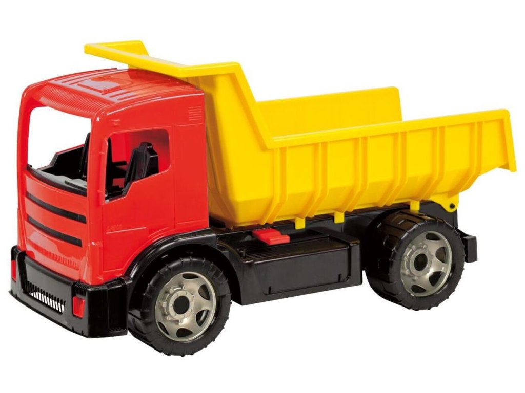 Plastové auto s rozšířenou korbou na vožení velkého a těžkého nákladu. Korbu je možno zajistit pojistkou proti nežádoucímu vyklopení. Velikost 62x26x35cm. Vyrobeno v ČR.