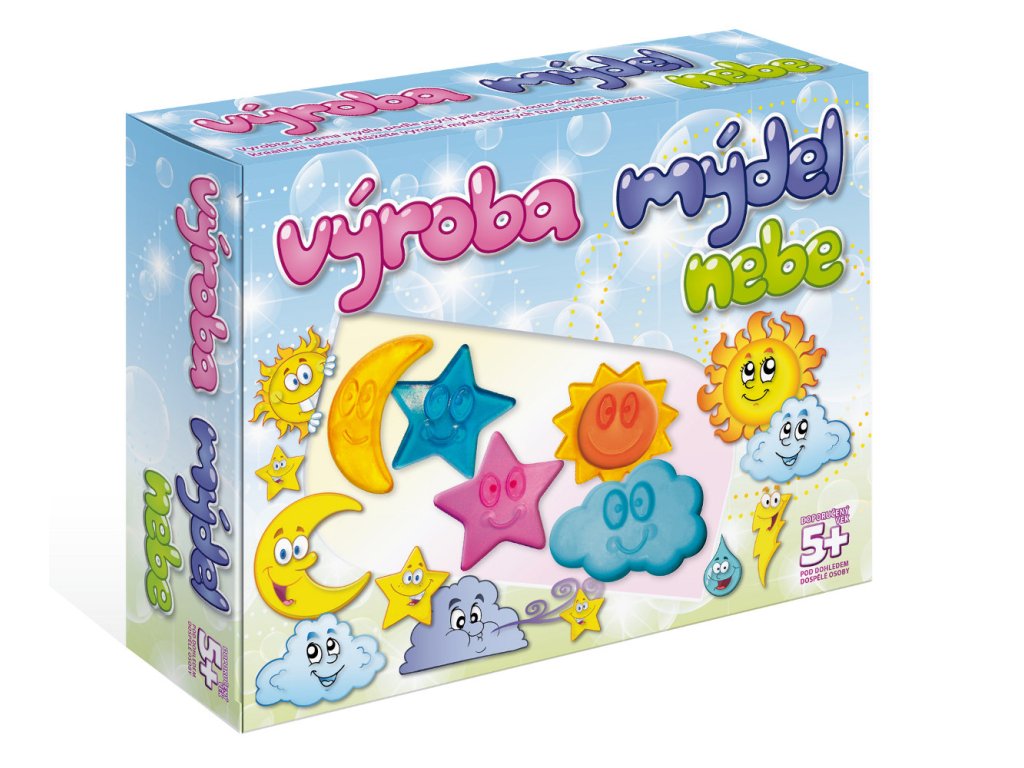 Kreativní sada pro výrobu mýdla. Balení obsahuje: blok čistého mýdlového základu, blok žlutého mýdlového základu, blok modrého mýdlového základu, blok červeného mýdlového základu, formičku, tyčinku na promíchávání a kádinku pro rozpuštění a rozmíchání. Možno použít v mikrovlnné troubě. Z jedné sady lze vyrobit 8 - 10 mýdel. Vhodné od 5 let.