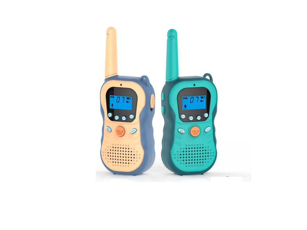 Vysílačky dětské. Rozměry 6x2,8x16 cm. Dosah až 3 km. Rádiové vlny. 4 druhy (normální, mužský, ženský, robotí). 8xAAA baterie (4xAAA do každé vysílačky) nejsou součástí. Přepínač ON/OFF na pravé straně vysílačky. Oranžové tlačítko - pro mluvení. Tlačítka ovládání hlasitosti (nahoru a dolů v menu) na levé straně vysílačky. Návod součástí.