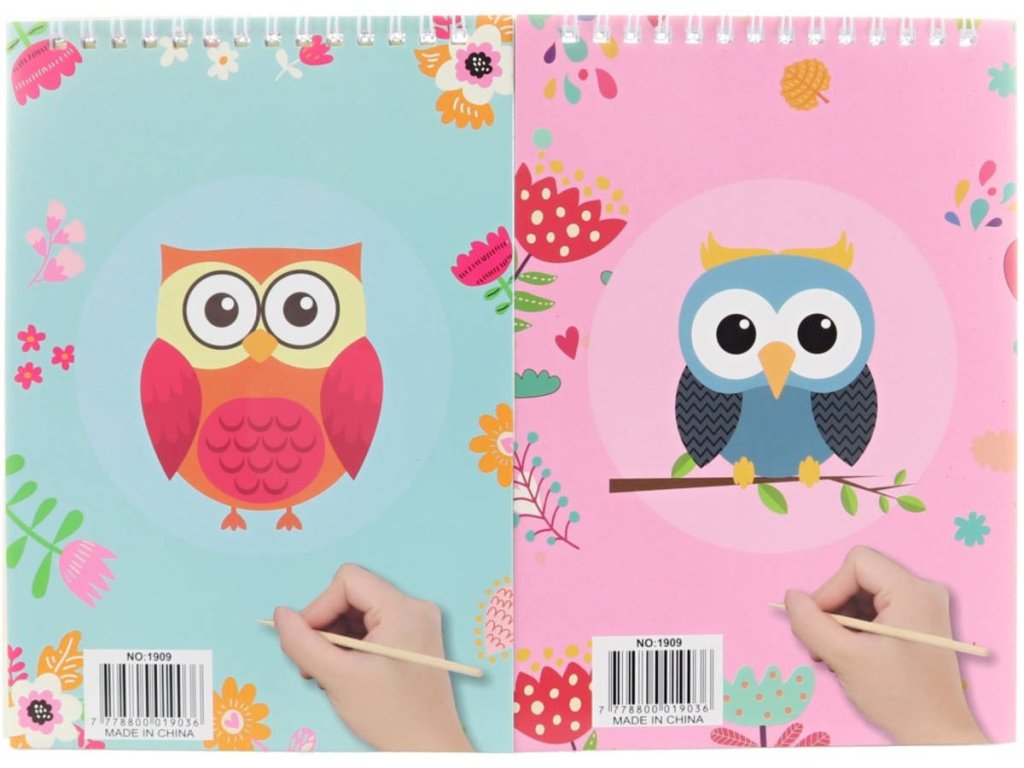 Vyškrabovací sešit s kroužkovou vazbou, s motivem Sovičky. Obsahuje 8 černých listů k vyškrabání, s barevným podkladem a dřevěné rydlo. 2 varianty provedení.