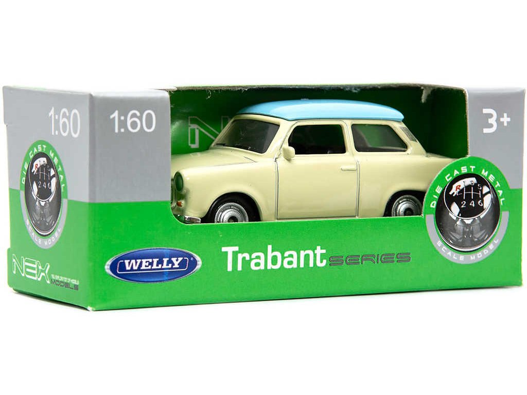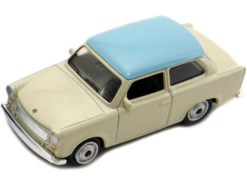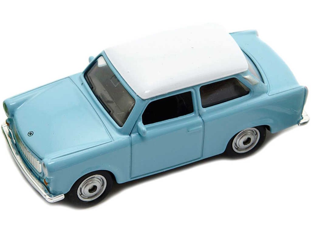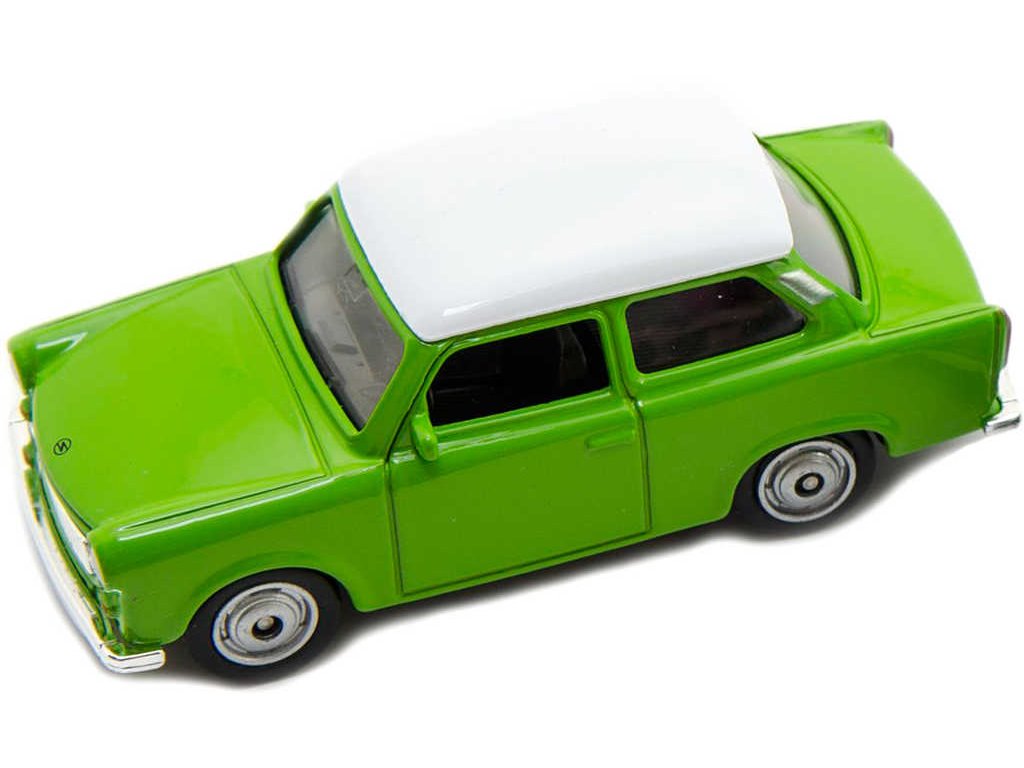trabantem! Model ve třech barevných kombinacích. Má otevírací dveře (dvířka lze otevírat). Vůz vyroben tlakovým litím z kovové slitiny v kombinaci s plastovými díly. Baleno v krabičce.