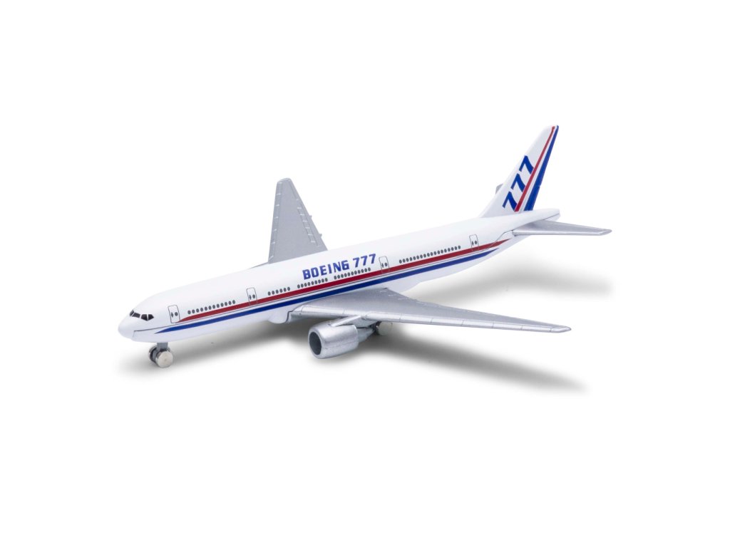 Miniatura dopravního letadla Boeing 777 z kovu a plastu. Dodáváno v různobarevné papírové krabičce s plastovým průhledem.   Hlavní vlastnosti:kovové provedení
