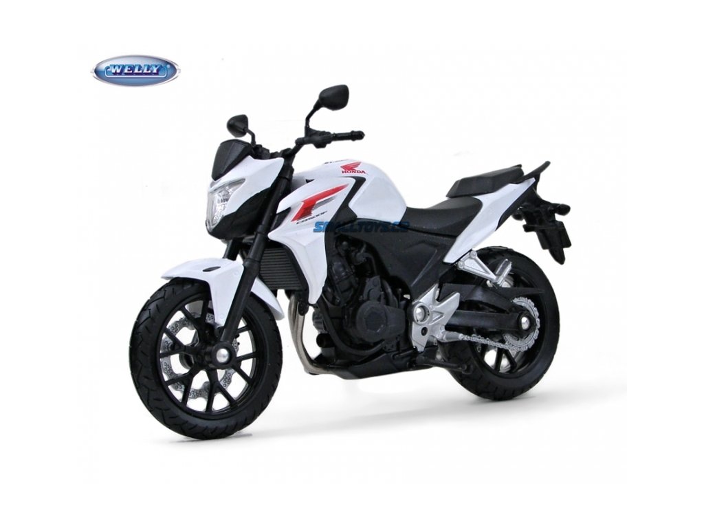 Welly - Motocykl Honda CB500F model 1:10 bílá Model motocyklu v měřítku 1:10 vyrobený z kovových a plastových dílů. Motocykl je zabalen v papírové krabičce s fóliovým průhledem. Otočná řídítka, odpružená zadní vidlice. Délka modelu cca 19 cm.
