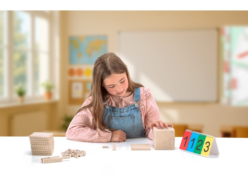 Dienesova základní sada pro názorné vyučování matematiky pomáhá dětem pochopit principy desítkové soustavy, vztahy mezi jednotkami, desítkami, stovkami a tisícem. Manipulací s kostkami si žáci osvojují číselné struktury, rozvíjejí porozumění místní hodnotě číslic a učí se převádět mezi různými číselnými zápisy. Pomůcka je vhodná pro skupinovou i individuální práci, podporuje srovnávání objemů i základní prostorovou představivost. Dienes je pojmenování didaktických pomůcek a metodiky pro výuku matematiky vyvinutých Zoltánem P. Dienesem. Dienesovy bloky jsou soubory kostek, tyček a destiček různých velikostí a barev, které představují jednotky, desítky, stovky a tisíce. Tyto pomůcky slouží k názornému učení základních matematických konceptů, zejména desítkové soustavy, počítání, sčítání, odčítání a pochopení místa číslic v čísle. Vyrobeno z ekologického a odolného materiálu RE-Wood® v přírodní barvě. Zabaleno v kartonové krabičce s návodem. Obsah balení: 100 jednotlivých kostek10 desítkových tyček10 stovkových desek1 kostka tisícenávod Hlavní vlastnosti: zvýrazňuje strukturu čísel a desítkového systémupracuje s jednotkami, desítkami, stovkami a tisícemrozvíjí porozumění místní hodnotě číslicpodporuje porovnávání objemů a budování tělesvhodné pro individuální i skupinovou prácivyrobeno ze 100% recyklované dřevo RE-Wood® vyrobeno v Německuvhodné pro děti od 6 let